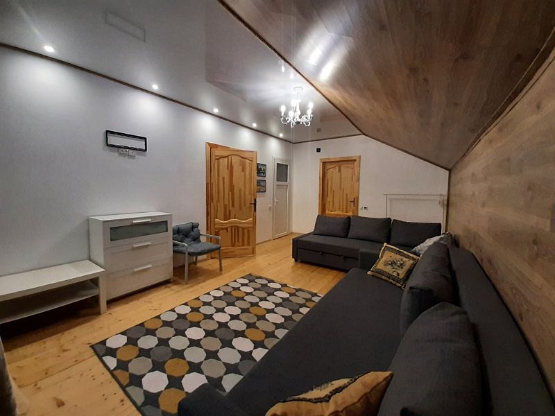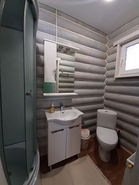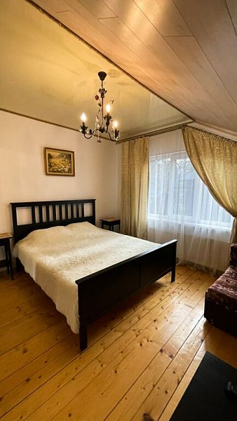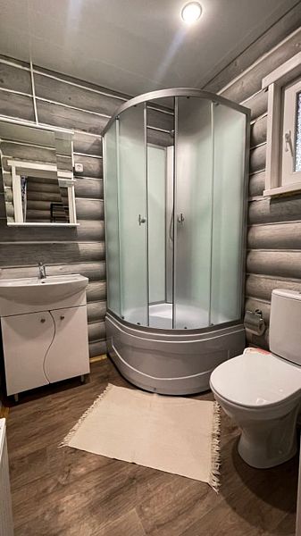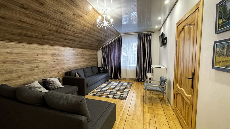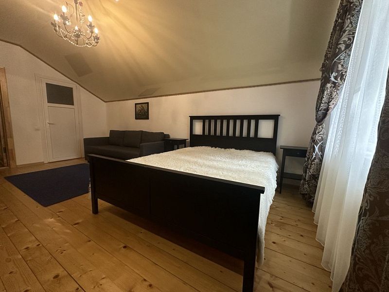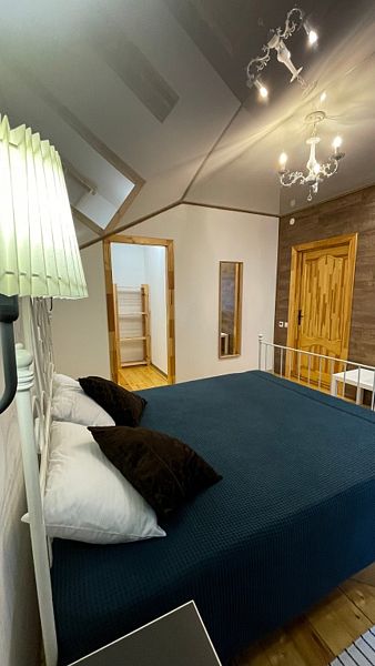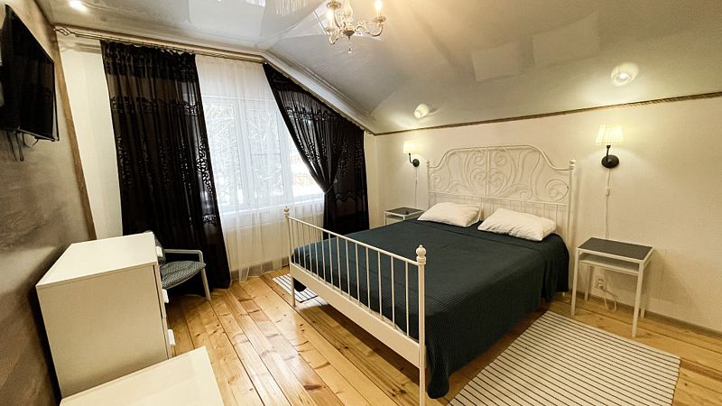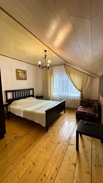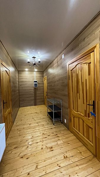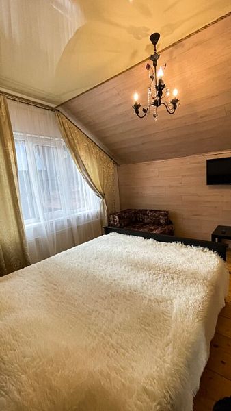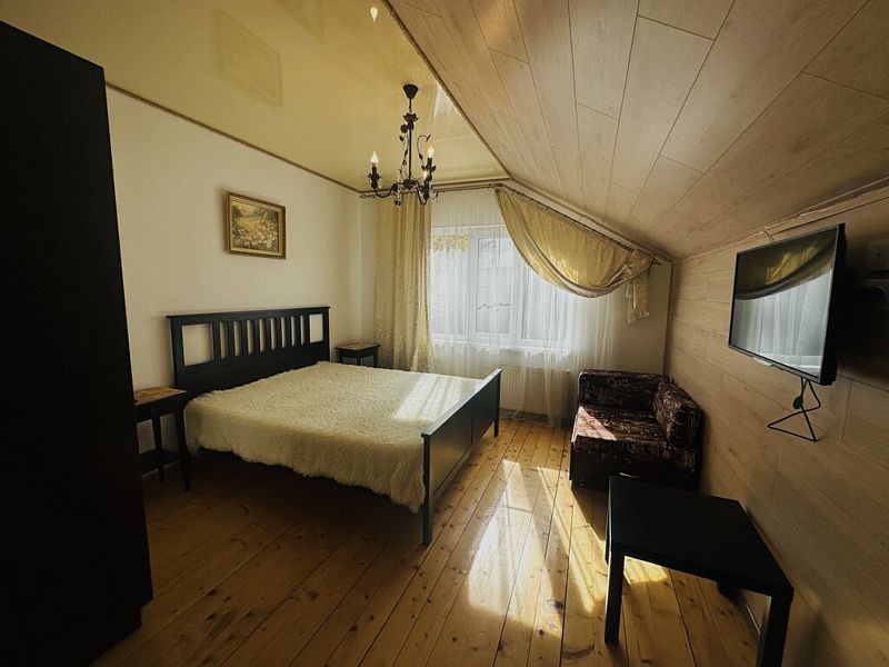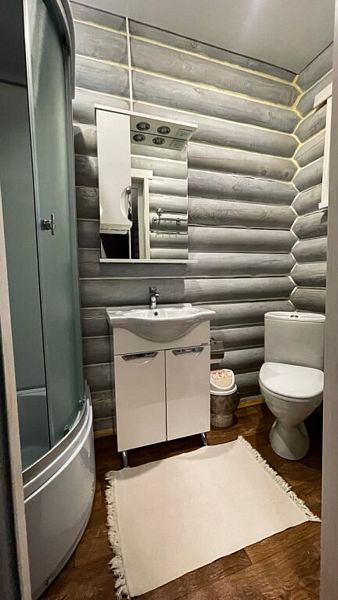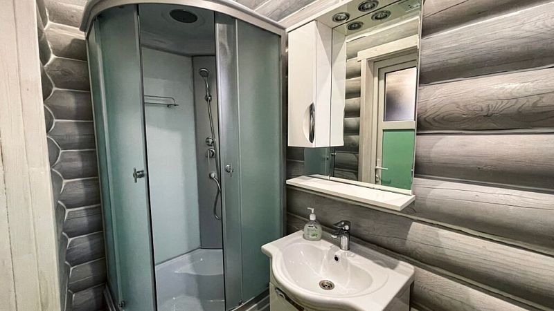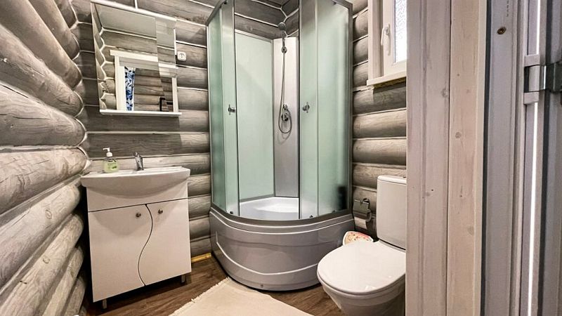 В двухэтажном доме из сруба 5 номеров и общая кухня.