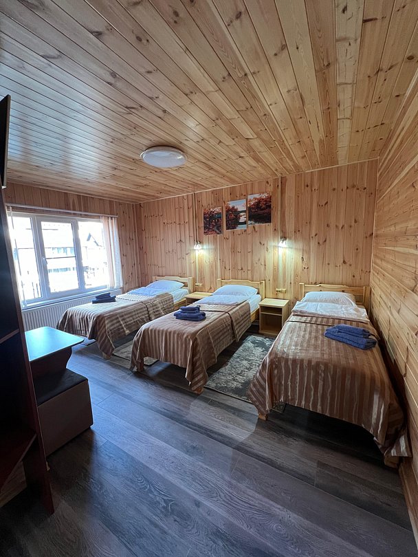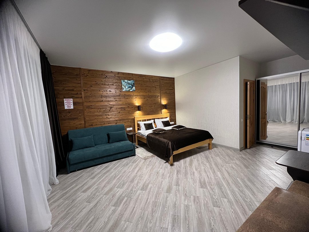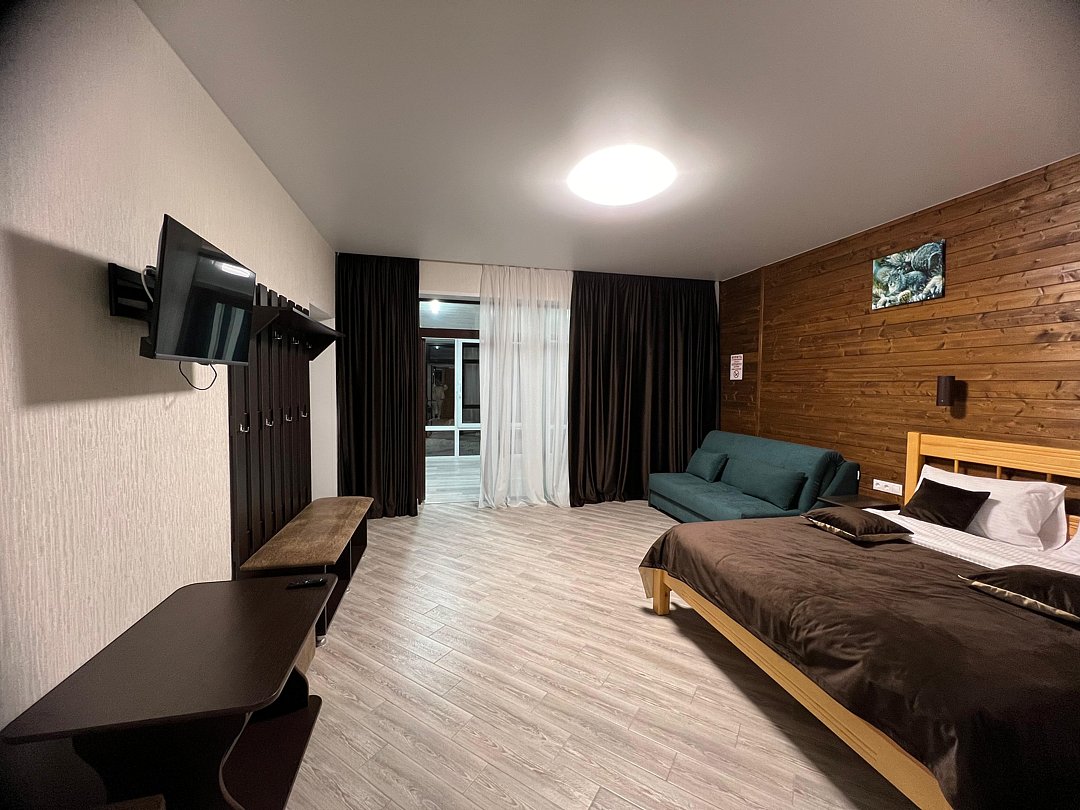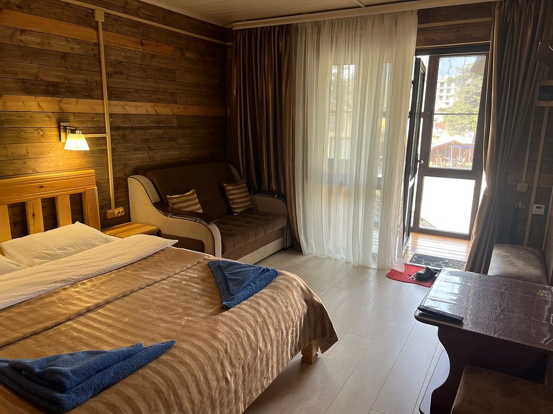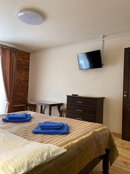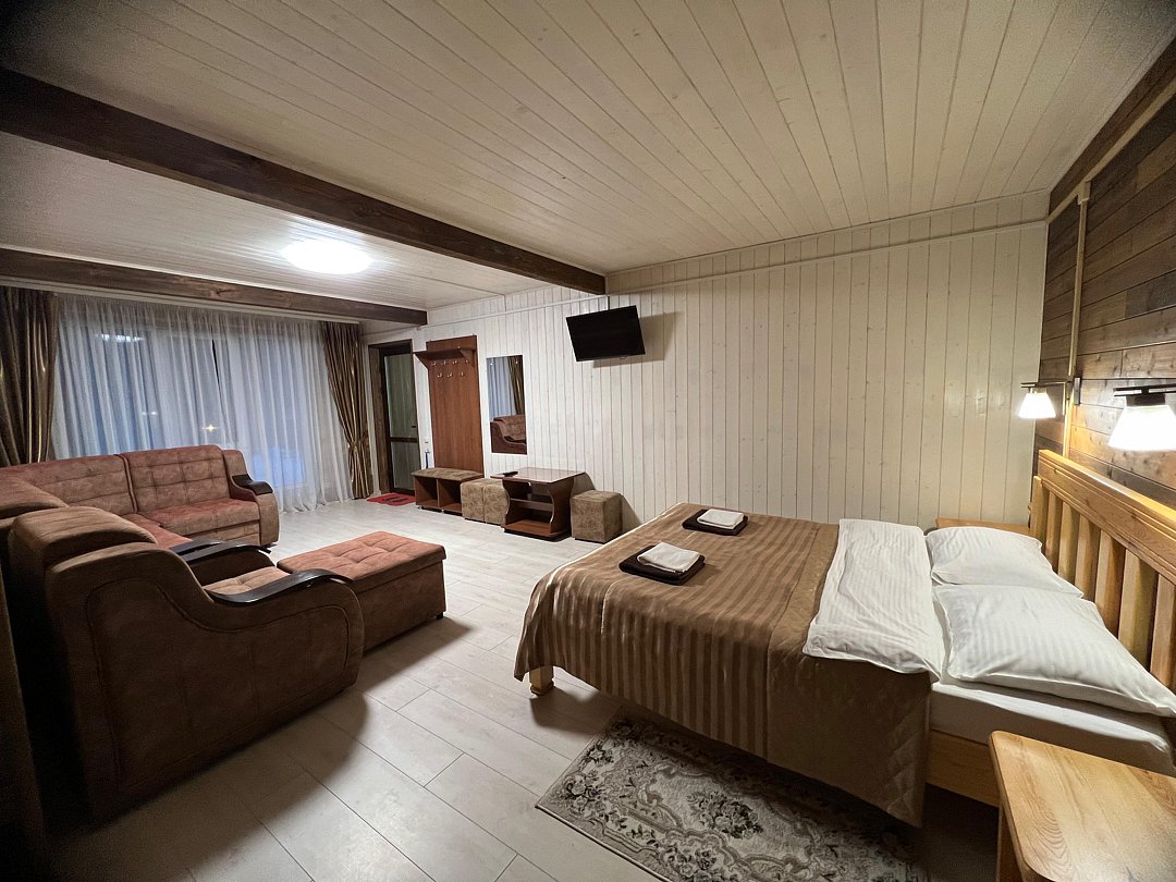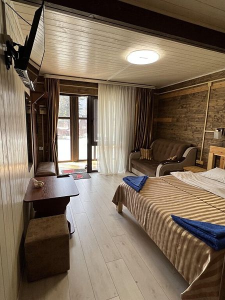 Совмещенный санузел с душем, фен, полотенца, водонагреватель. В номере кровать, ортопедический матрас, мягкая мебель, диван, еврораскладушка, ТВ, мини-холодильник, Wi-Fi, питьевая вода. Вешалки с обувницей. Терраса с ротанговой мебелью, стеклянным столиком и видом на горы.