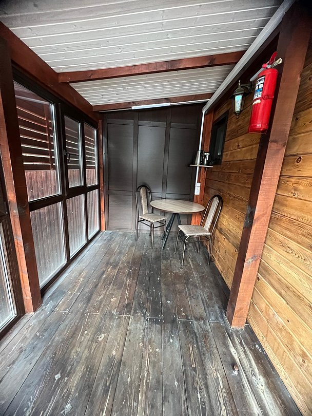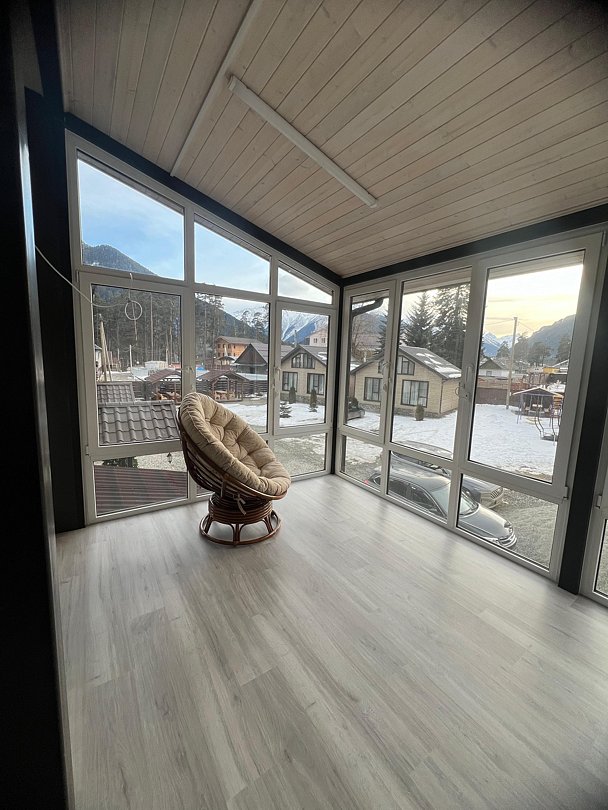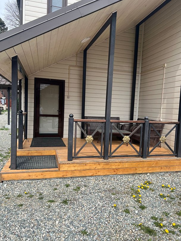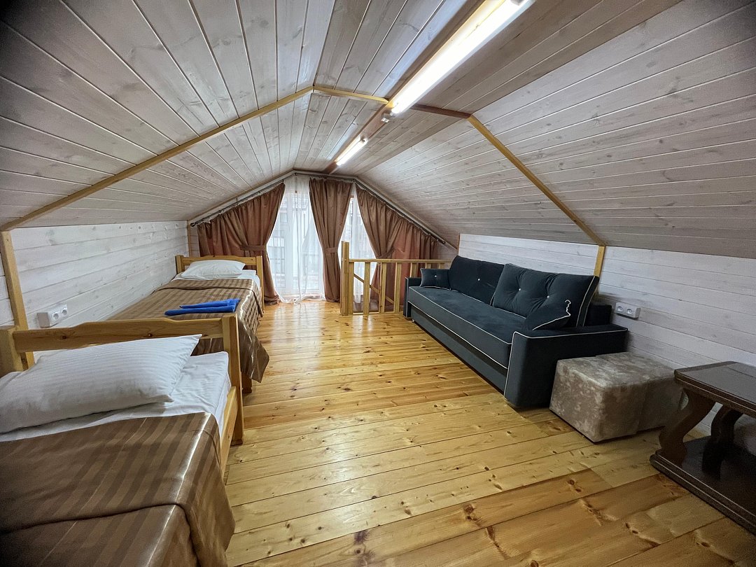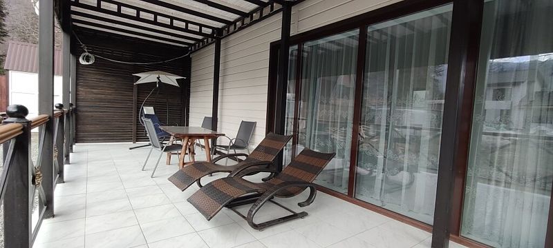 Совмещенный санузел с душем, фен, полотенца, водонагреватель. В номере кровать, ортопедический матрас, мягкая мебель, диван, еврораскладушка, ТВ, мини-холодильник, Wi-Fi, питьевая вода. Вешалки с обувницей. Веранда с ротанговой мебелью, стеклянным столиком и видом на горы.