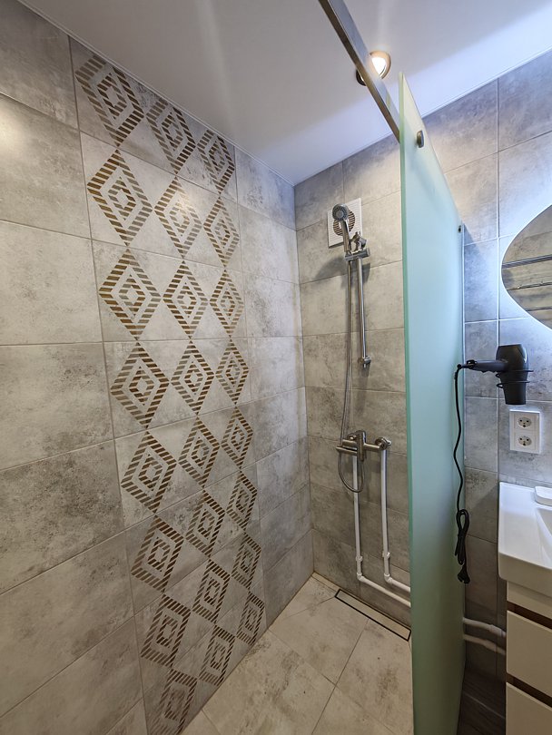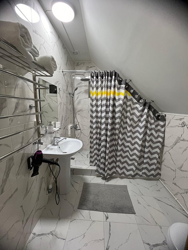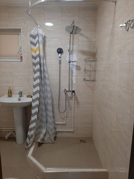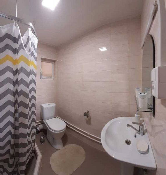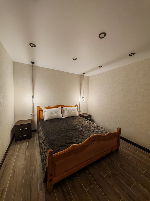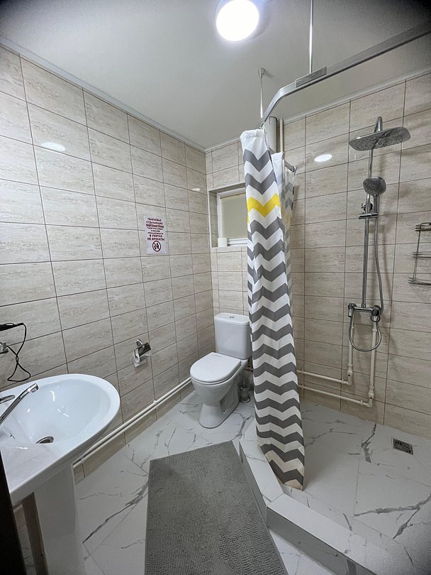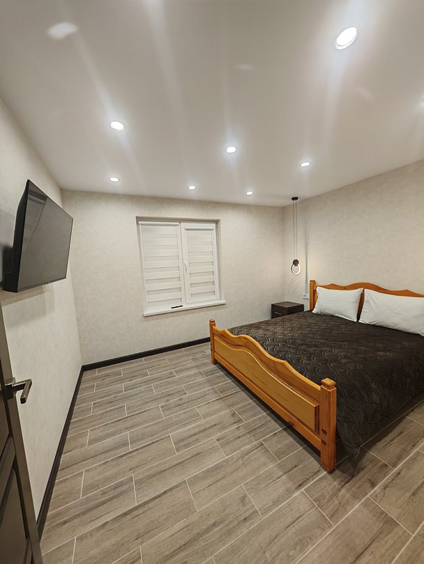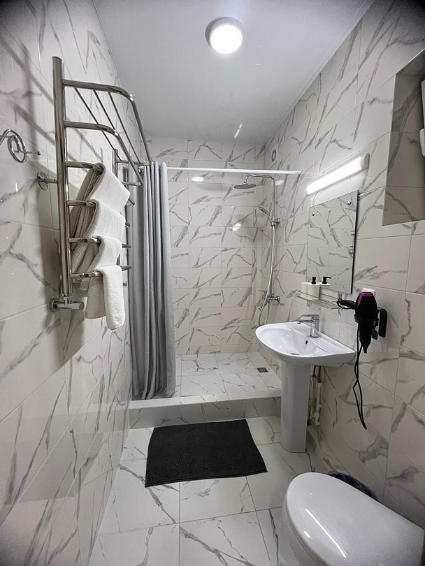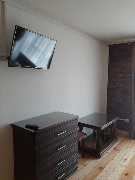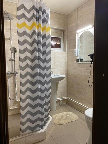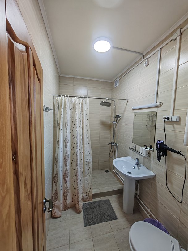 Совмещенный санузел с душем, фен, полотенца, водонагреватель. В номере кровать, ортопедический матрас, мягкая мебель, диван, ТВ, мини-холодильник, Wi-Fi, питьевая вода. Вешалки с обувницей.