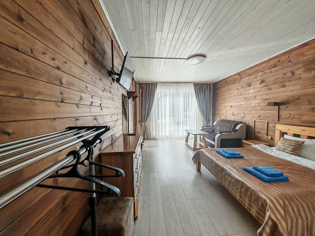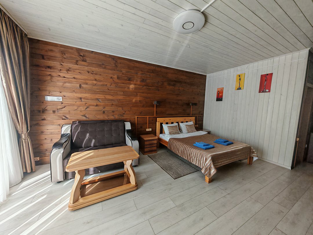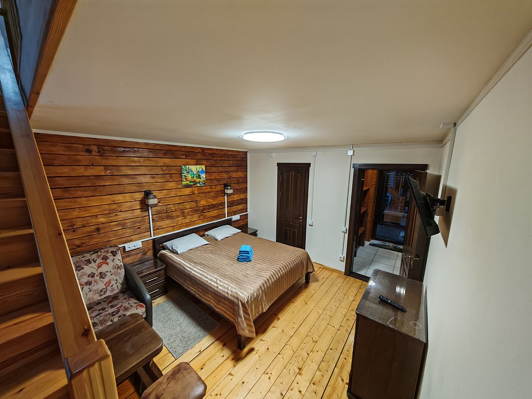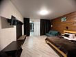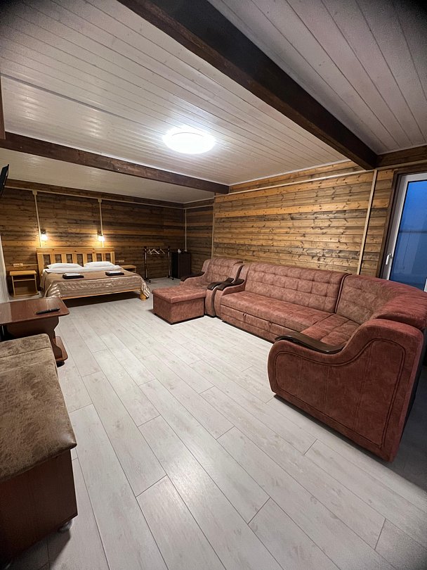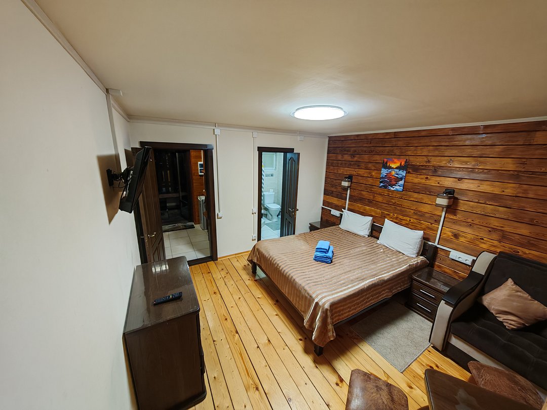 Совмещенный санузел с душем, фен, полотенца, водонагреватель. В номере кровать, ортопедический матрас, мягкая мебель, большой угловой диван, кресло, ТВ, мини-холодильник, Wi-Fi, питьевая вода. Вешалки с обувницей.