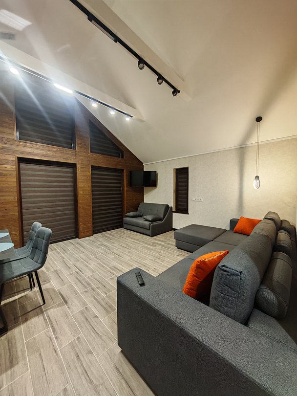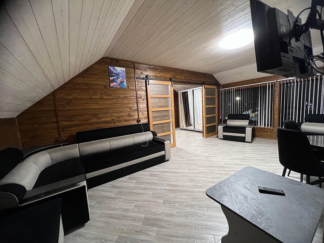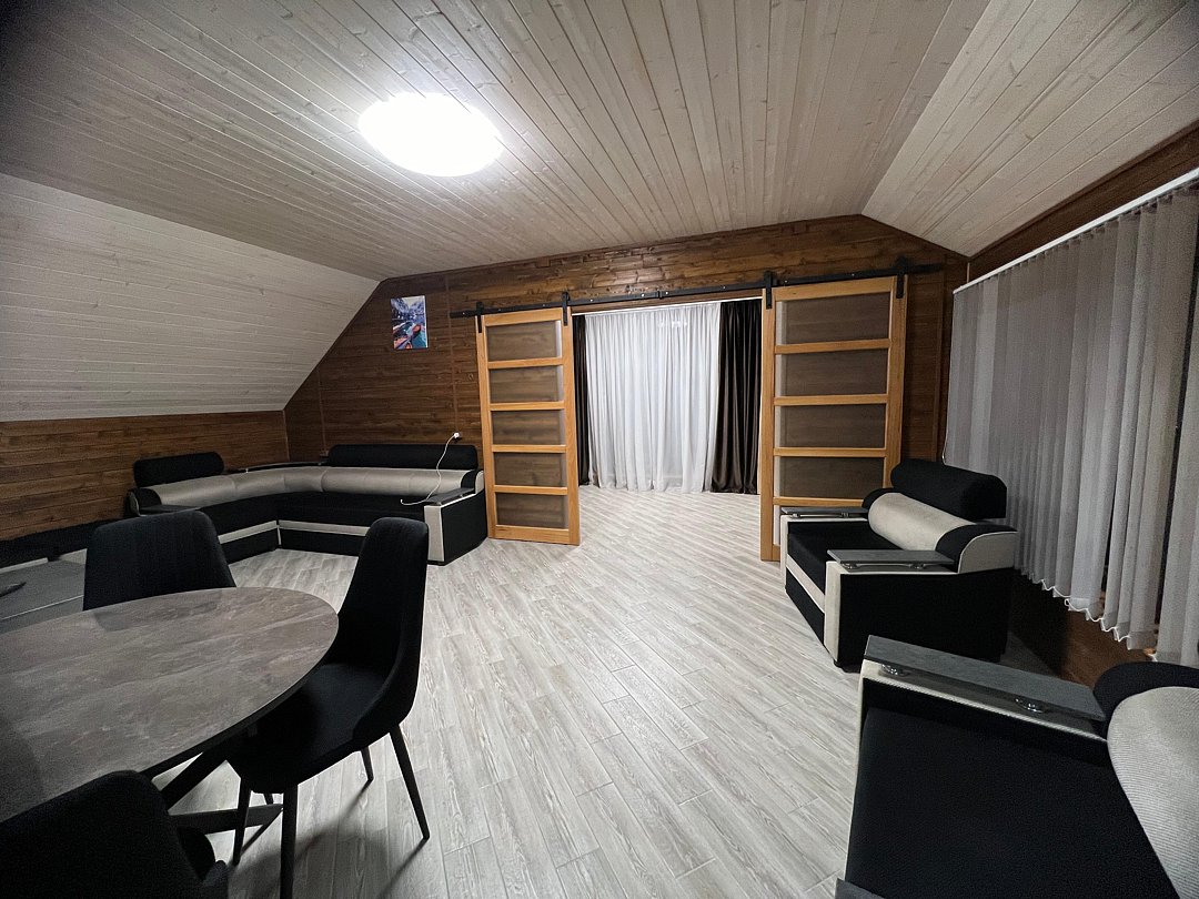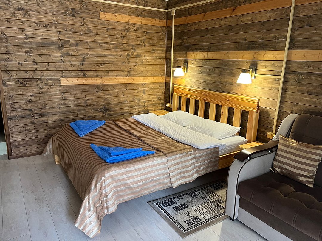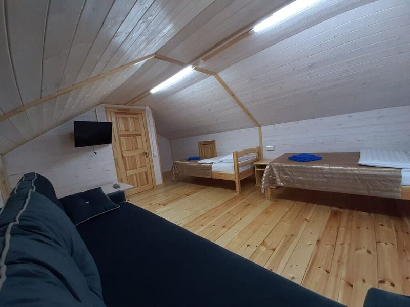 Совмещенный санузел с душем, фен, полотенца, водонагреватель. В номере кровать, ортопедический матрас, мягкая мебель, большой угловой диван, кресло, ТВ, мини-холодильник, Wi-Fi, питьевая вода. Вешалки с обувницей.