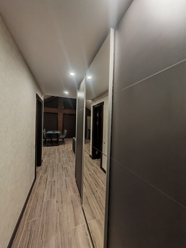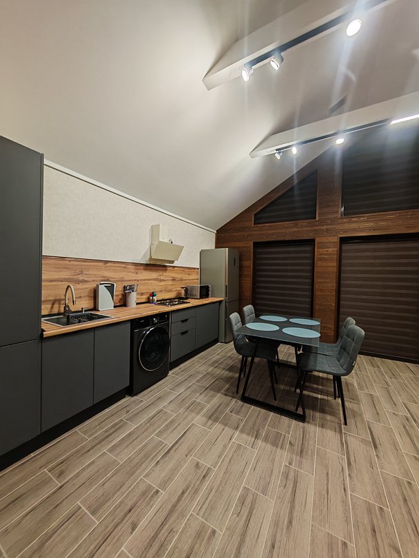 Совмещенный санузел с душем, фен, полотенца, халат. В номере гостиная с кухонной зоной большим диваном, спальня со сдвижными дверями, ортопедический матрас, мягкая мебель, 2 Smart-ТВ, мини-холодильник, Wi-Fi, чайник, чашки, набор посуды для 5 гостей, кухонный гарнитур с микроволновой печью. газовая плита, стиральная машина, питьевая вода.