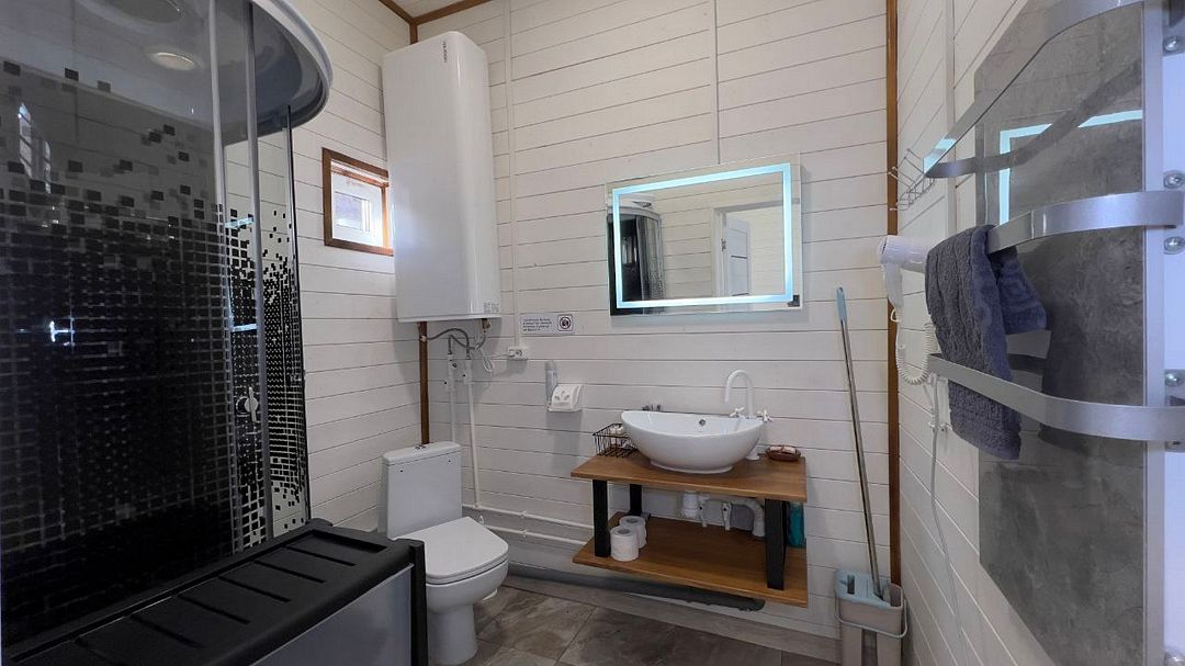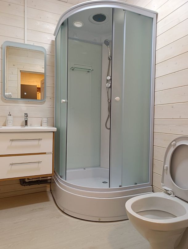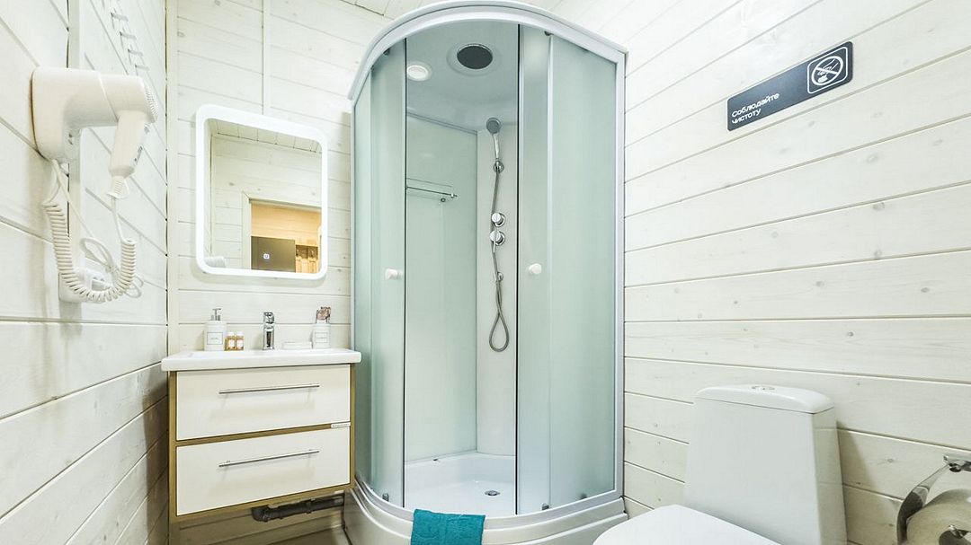 Индивидуальная ванная комната: душ, раковина, туалет.