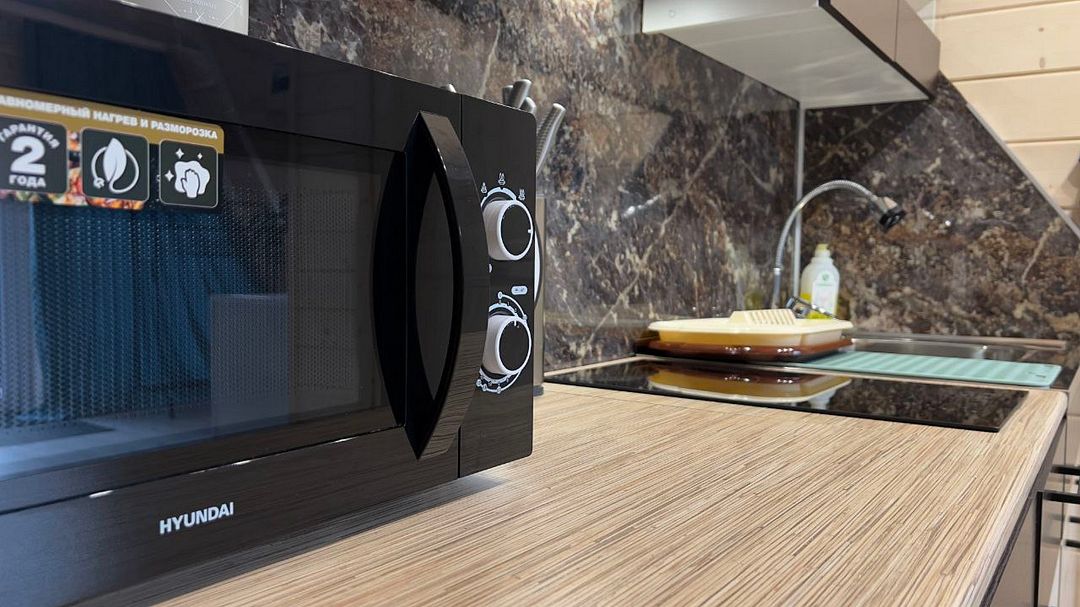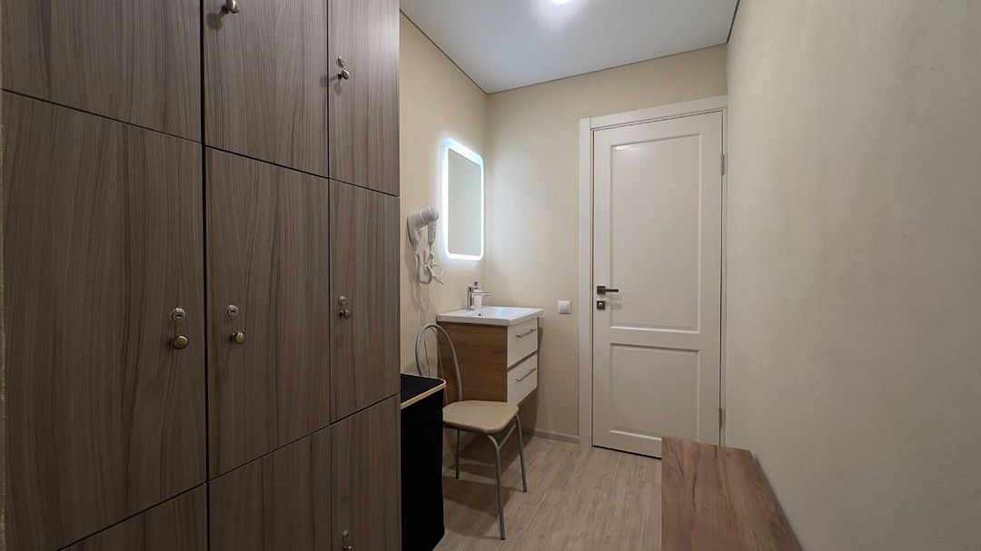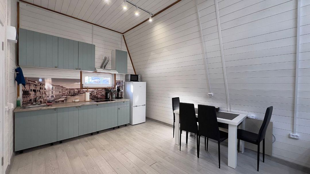 Имеется собственная кухня со всей необходимой техникой, телевизор, шкаф, вешалка, зеркало во весь рост, журнальный столик, комод, обеденный стол, стулья.