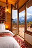 Номер расположен на третьем этаже и открывает живописный вид на горы из окна.