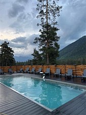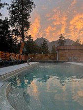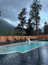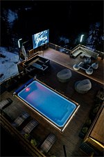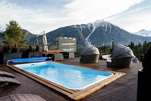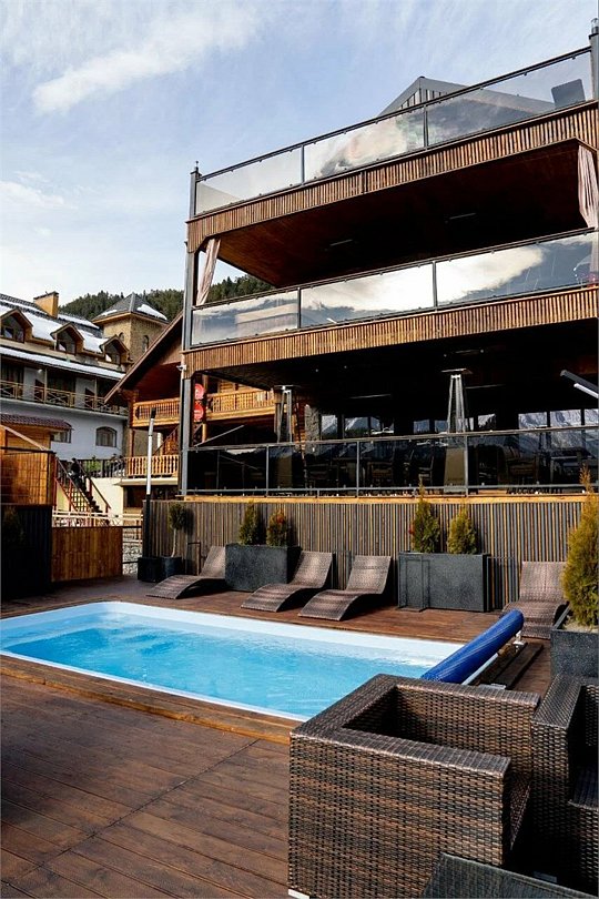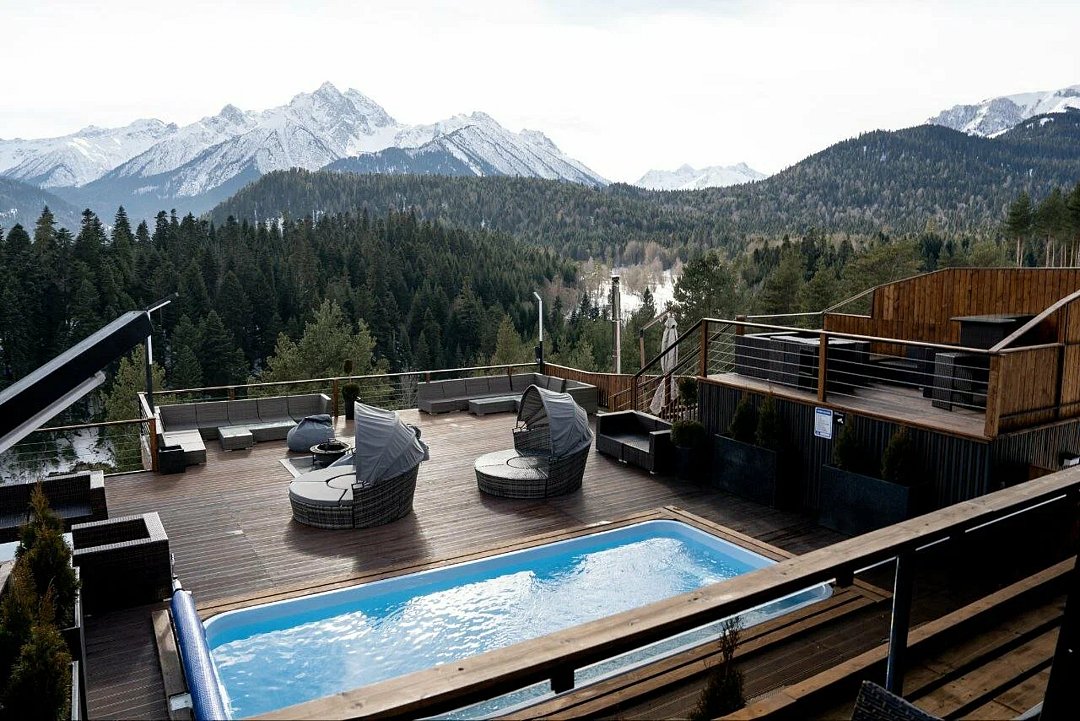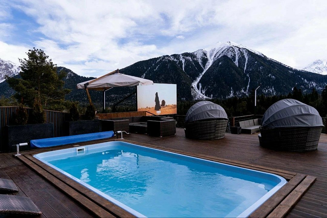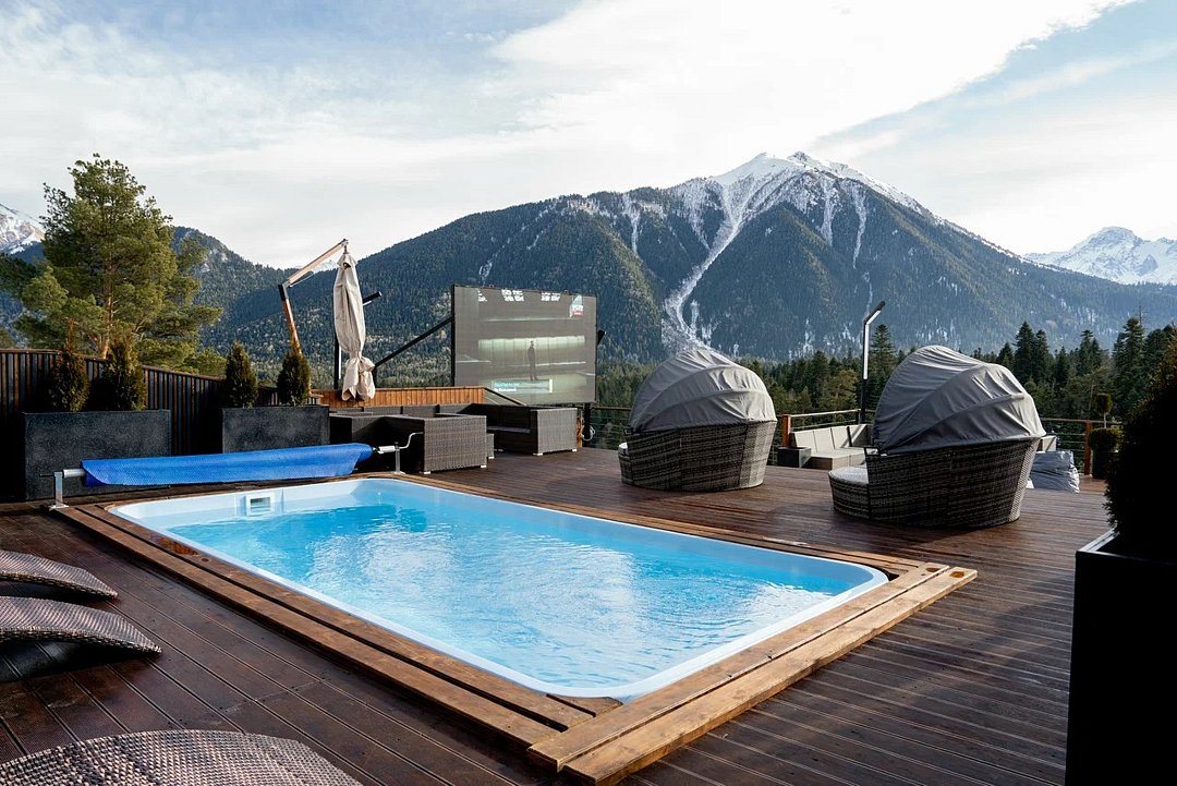 Бассейн с подогревом на крыше с видом на горы. Стоит отметить, что бассейн находится на отдельной территории на Софийской Поляне в сосновом лесу, что дополнительно украшает Ваш отдых.