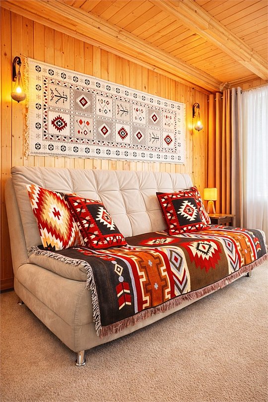 Номер, выполненный из экологичного бруса, отличается тёплой атмосферой и естественным уютом.