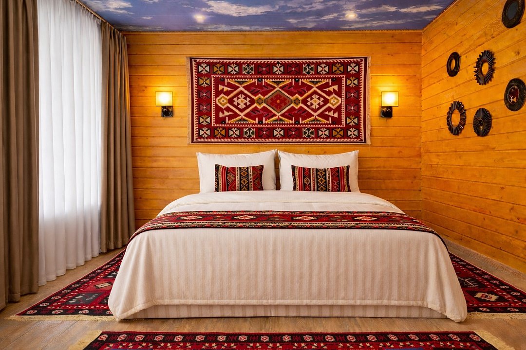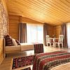 Двухкомнатный улучшенный стандартный номер, выполненный из экологичного бруса, отличается тёплой атмосферой и естественным уютом. Натуральная фактура древесины создаёт ощущение близости к природе, при этом предполагая некоторую слышимость — характерную особенность деревянных интерьеров.