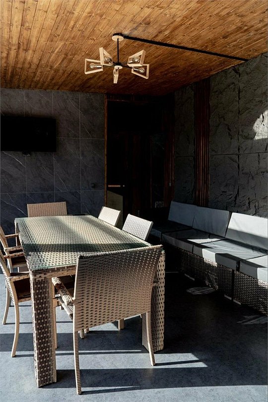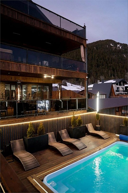 Инфраструктура: бассейн, зона отдыха, душРусская баня с бассейном и зоной отдыха. В самой парилке и в зоне отдыха Вы можете наслаждаться головокружительными видами на горы с панорамных окон на всю стену. С предбанника можно выйти прямо на открытую террасу с подогреваемым бассейном и зоной отдыха с шезлонгами и безупречными видами на горы.
