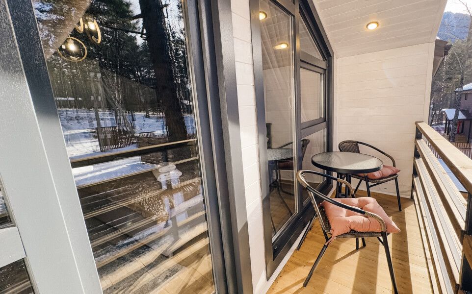 Каждый дом стоит на собственной огороженной территории с парковочным местом и уютной террасой, оборудованной садовой мебелью и мангалом для приготовления ароматных блюд на открытом воздухе. Из панорамных окон открываются захватывающие виды на лесные массивы и величественные горные вершины.