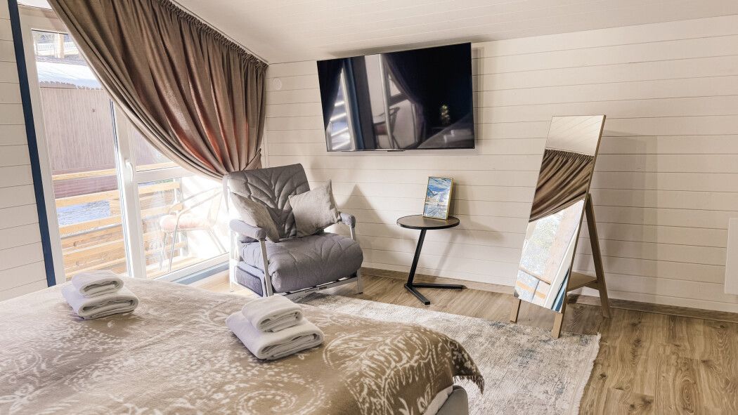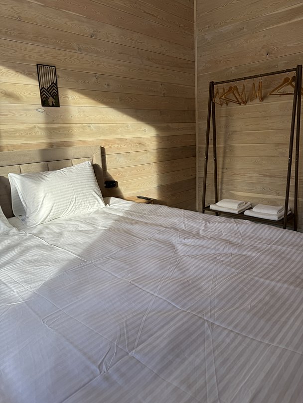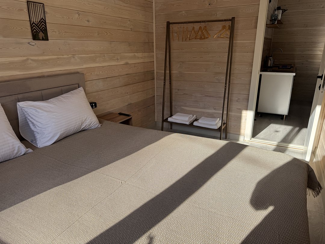 Для вашего комфорта предусмотрено все необходимое: электрические конвекторы поддерживают оптимальную температуру, свежее постельное белье и мягкие махровые тапочки ждут вас после активного дня. В ванной комнате вы найдете пушистые полотенца и базовые гигиенические принадлежности.