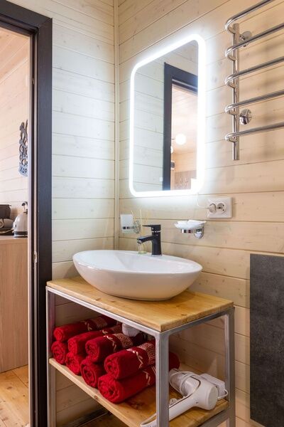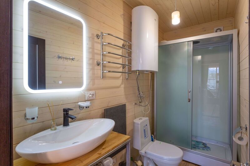 • санузел с большой душевой кабиной, феном, полотенцесущителем и зеркалом с подсветкой