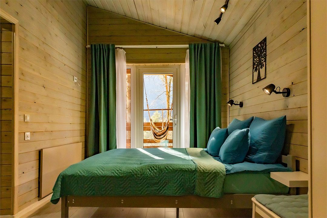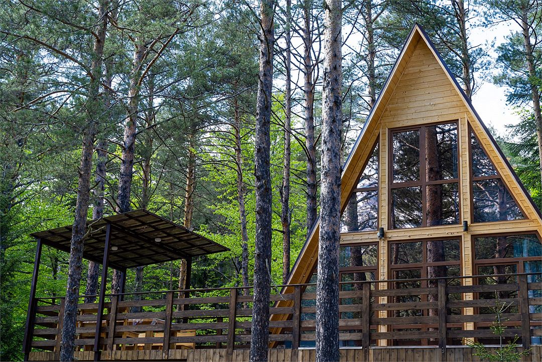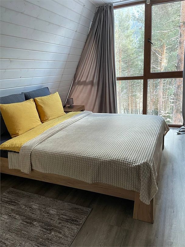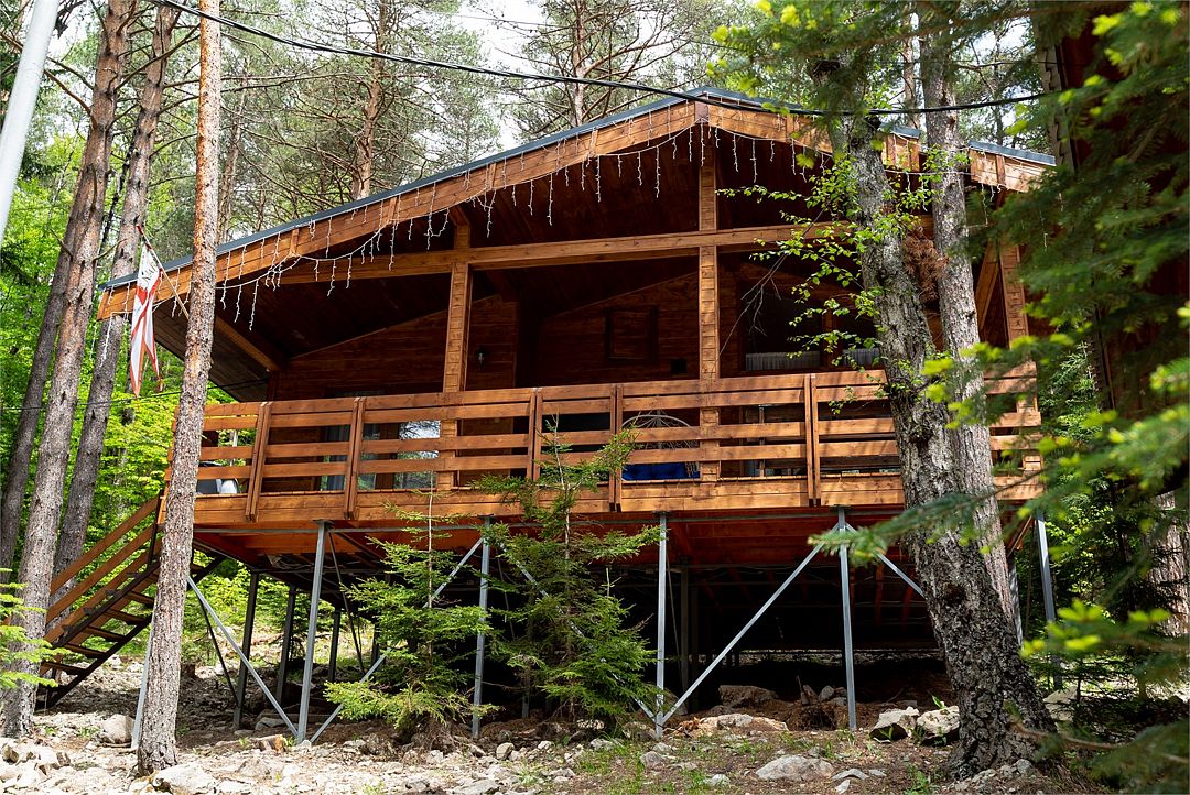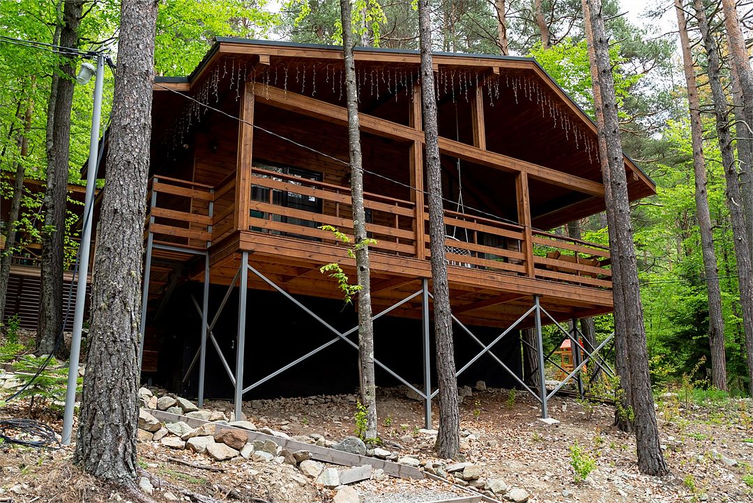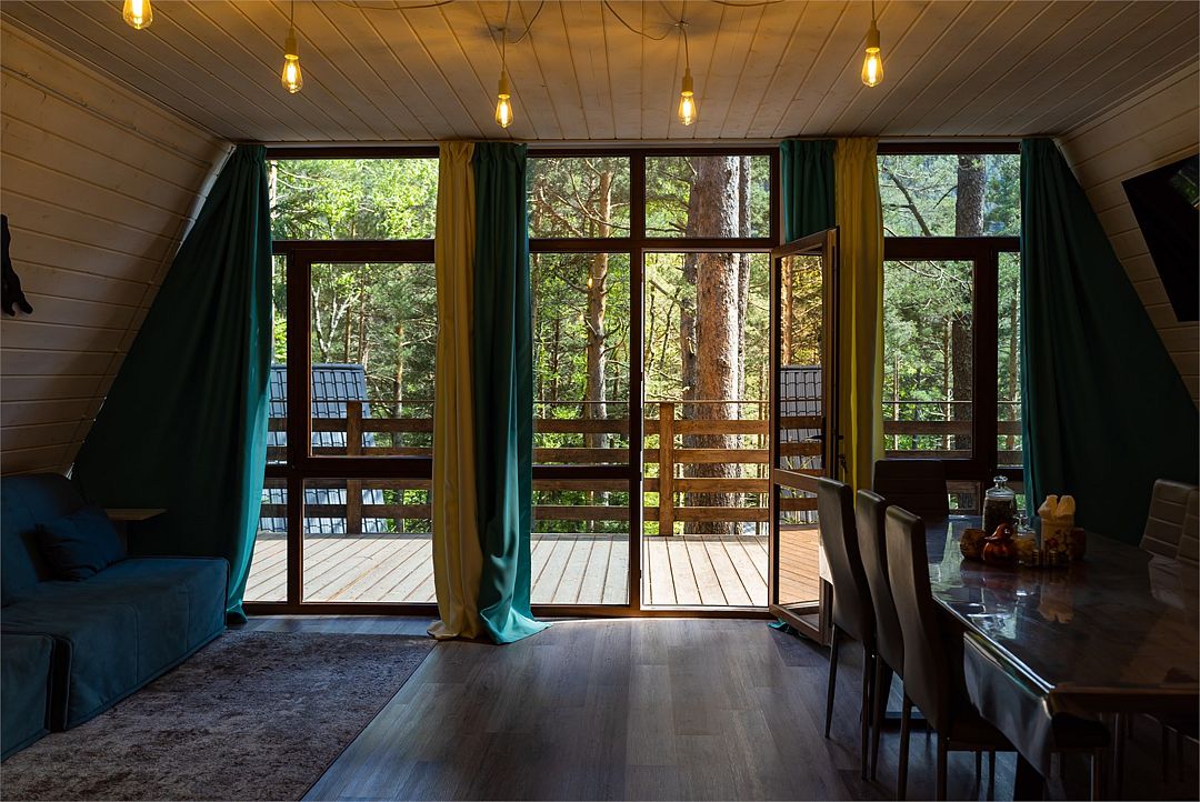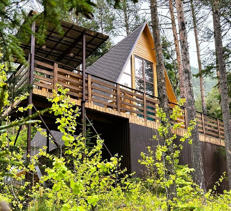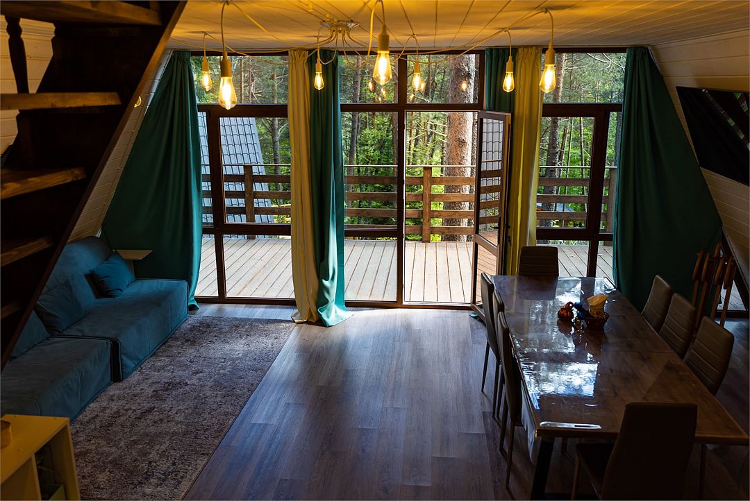 Просторный дом-шалаш с 2 мя спальнями на втором этаже и просторной гостиной на первом площадью 70 м2. С большой террасы открываются невероятные по красоте виды на горы и лес.