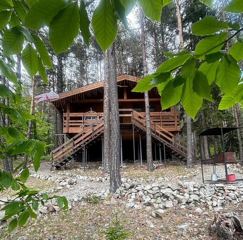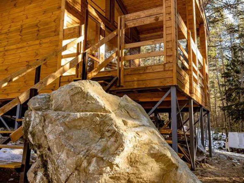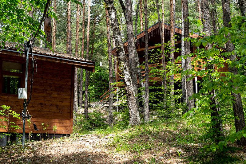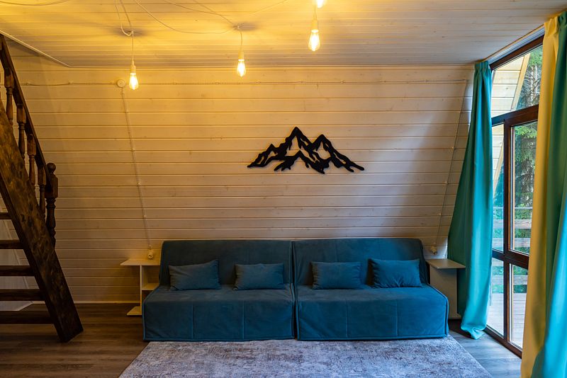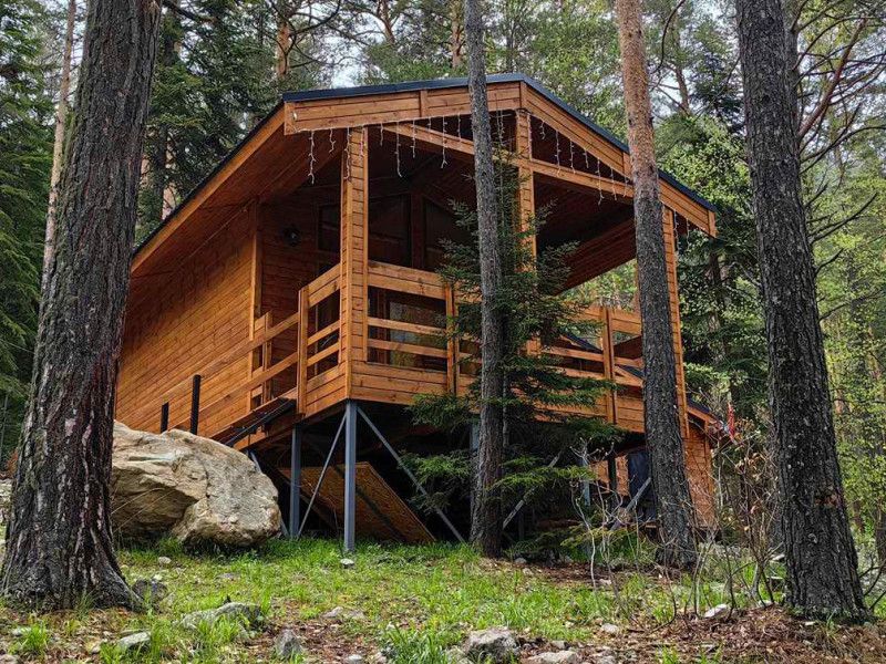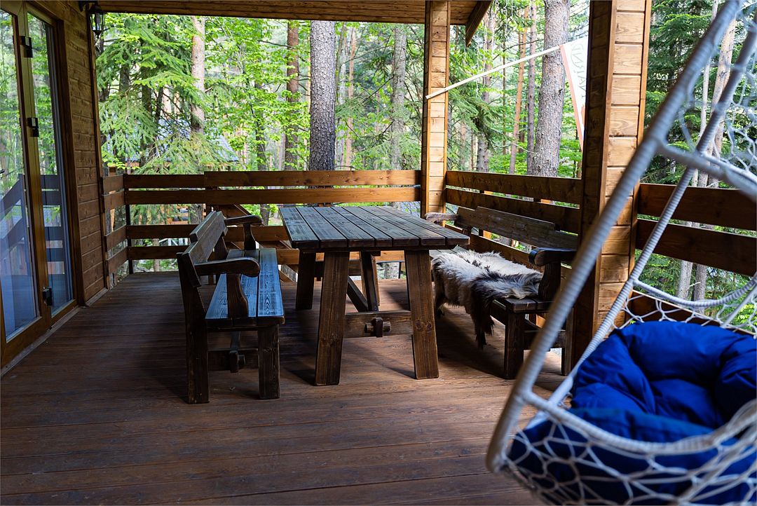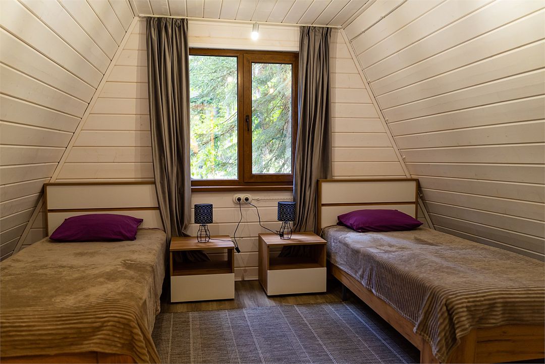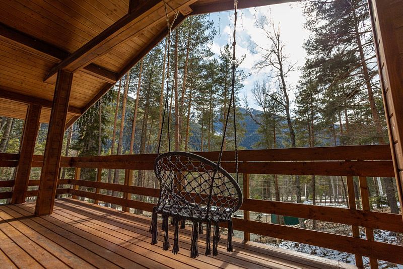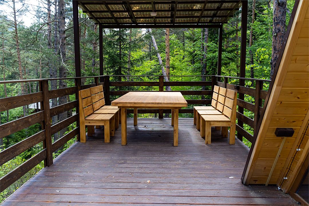 Просторный дом-шалаш с 2 мя спальнями на втором этаже и просторной гостиной на первом площадью 70 м2. С большой террасы открываются невероятные по красоте виды на горы и лес.