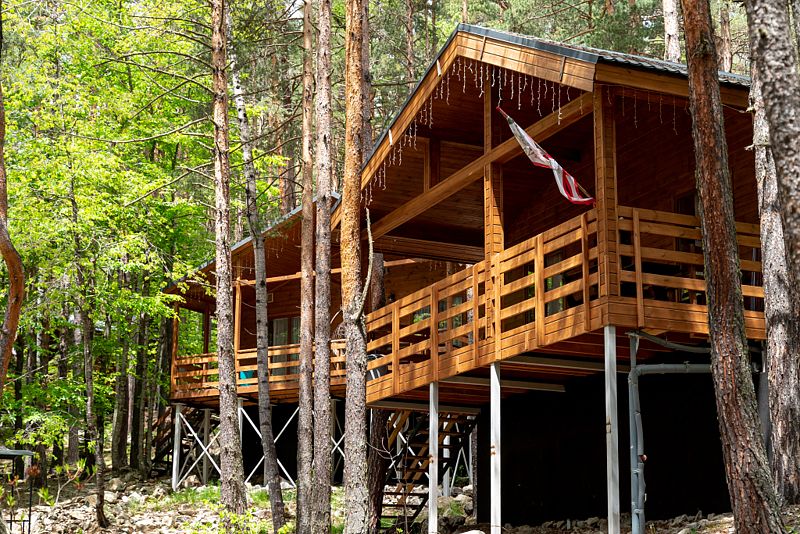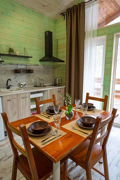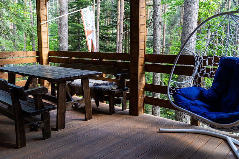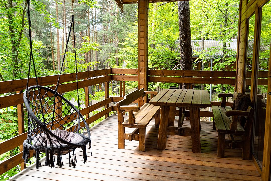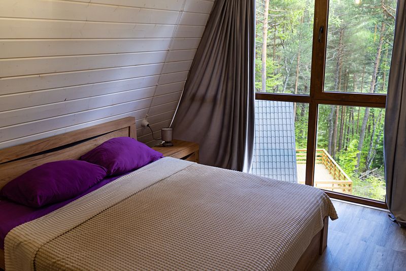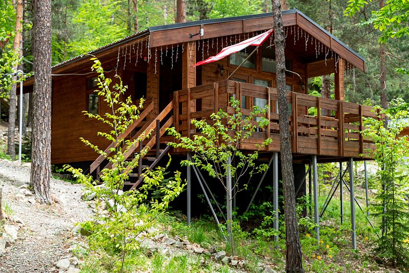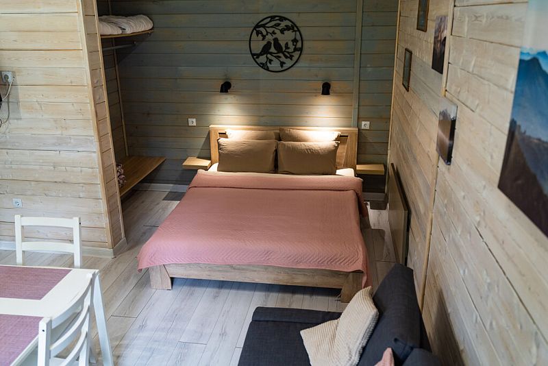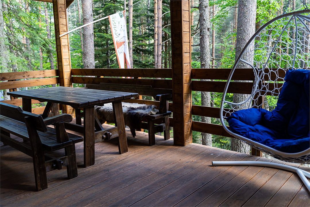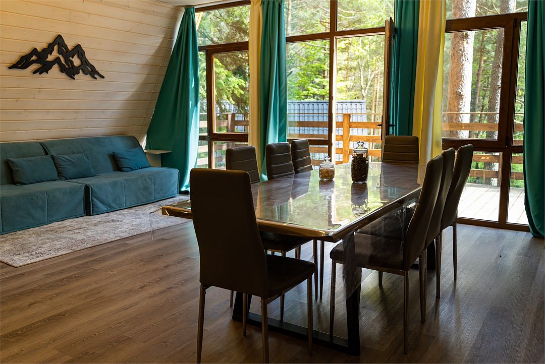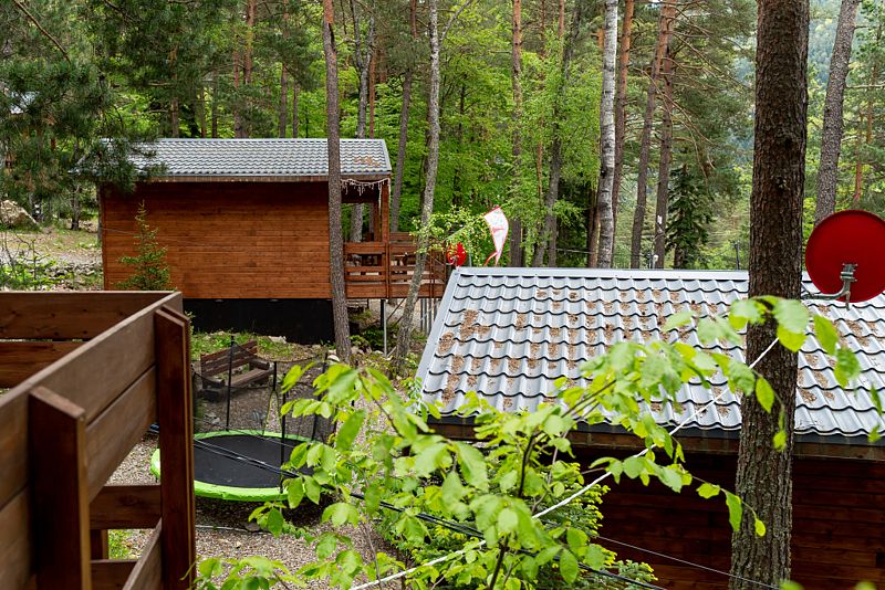 Просторный дом-шалаш с 2 мя спальнями на втором этаже и просторной гостиной на первом площадью 70 м2. С большой террасы открываются невероятные по красоте виды на горы и лес.