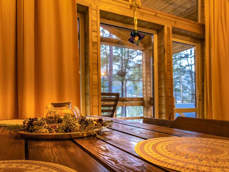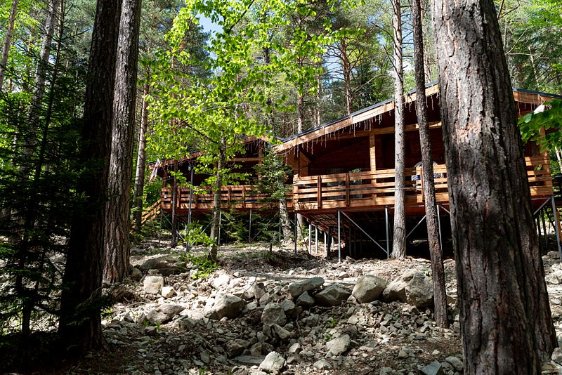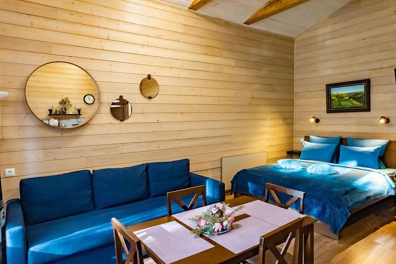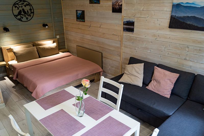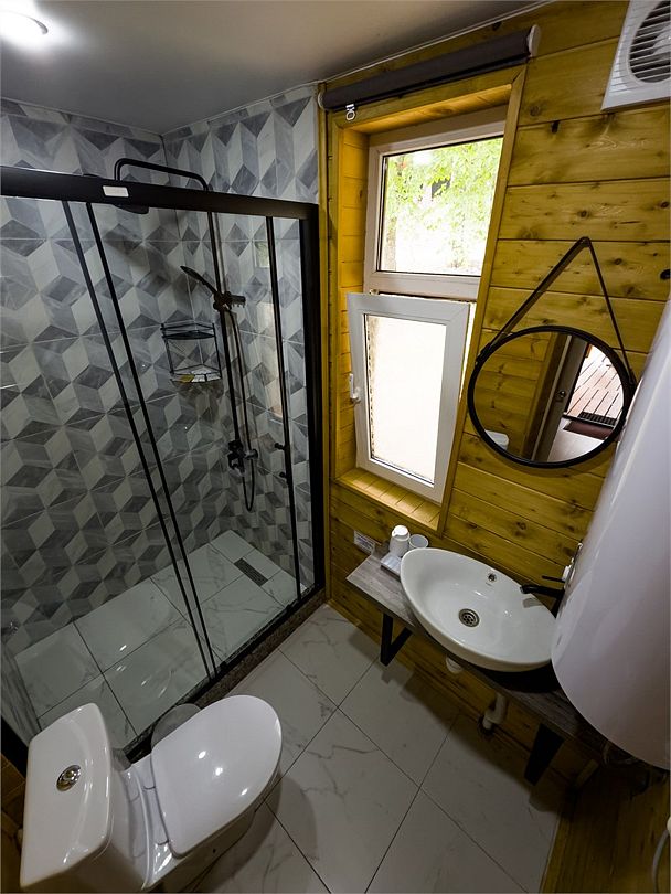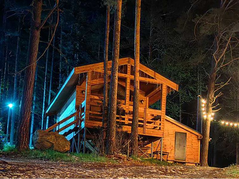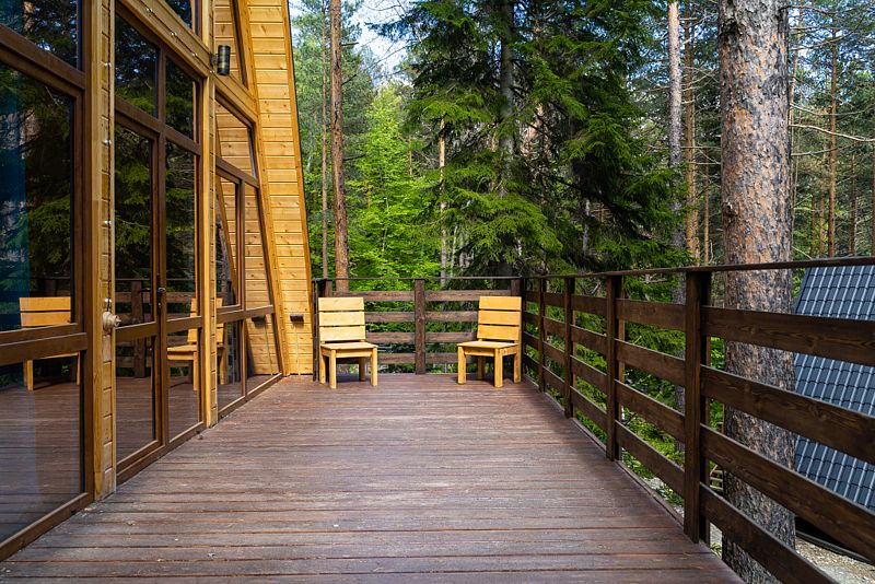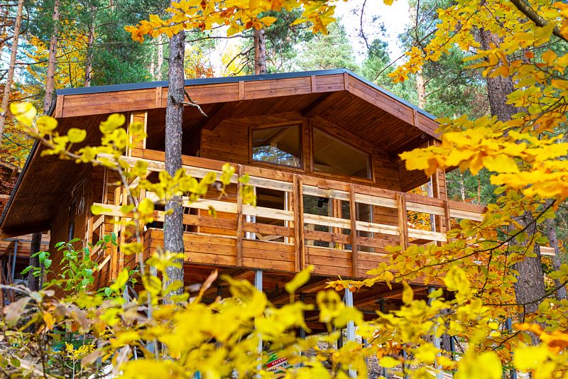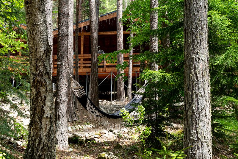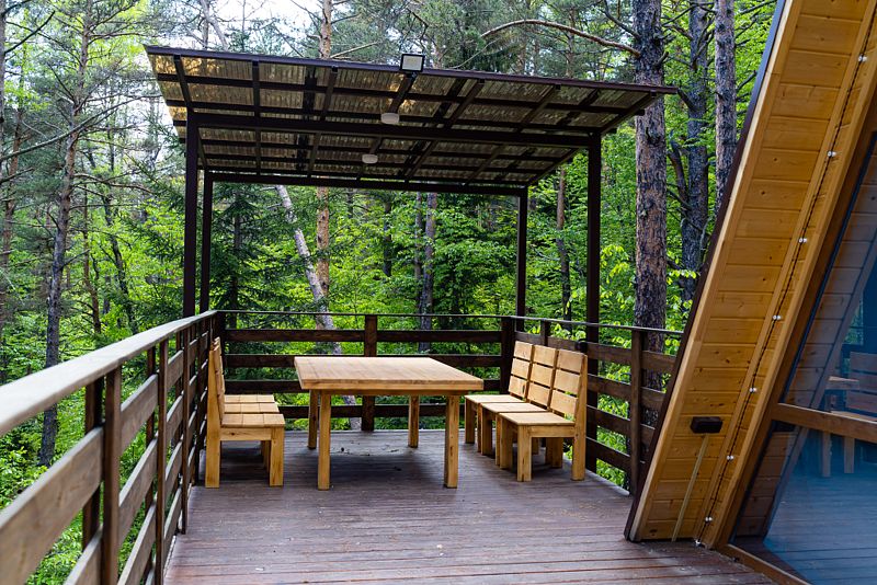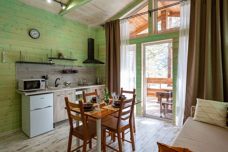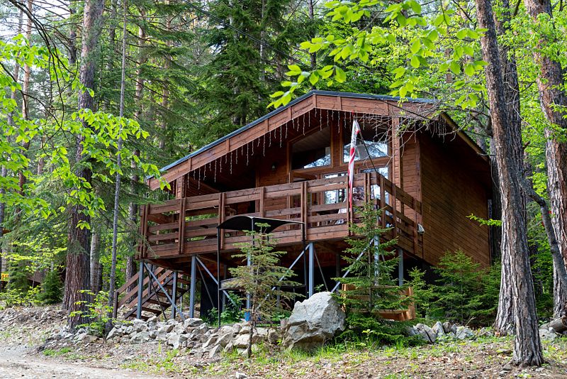 Просторный дом-шалаш с 2 мя спальнями на втором этаже и просторной гостиной на первом площадью 70 м2. С большой террасы открываются невероятные по красоте виды на горы и лес.