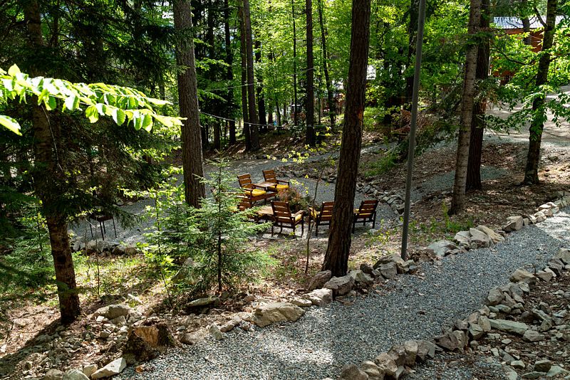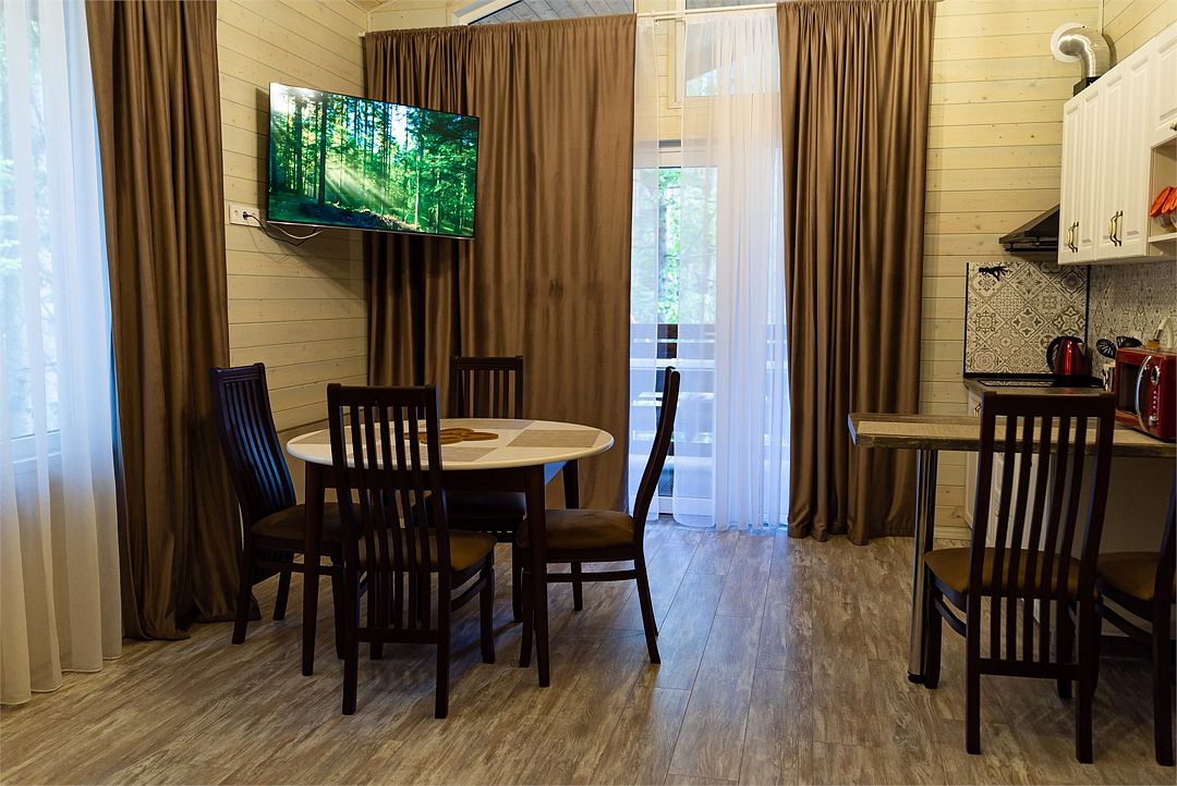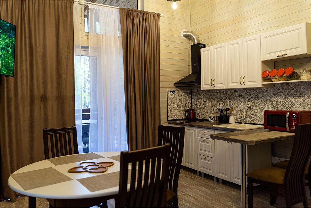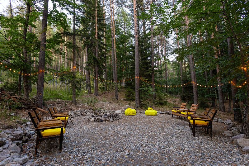 На территории работает стабильный Wi-fi, есть бесплатная парковка, терраса с незабываемым видом и удобной мебелью, костровая зона, а также русская баня на дровах. Возле каждого коттеджа оборудована мангальная зона.