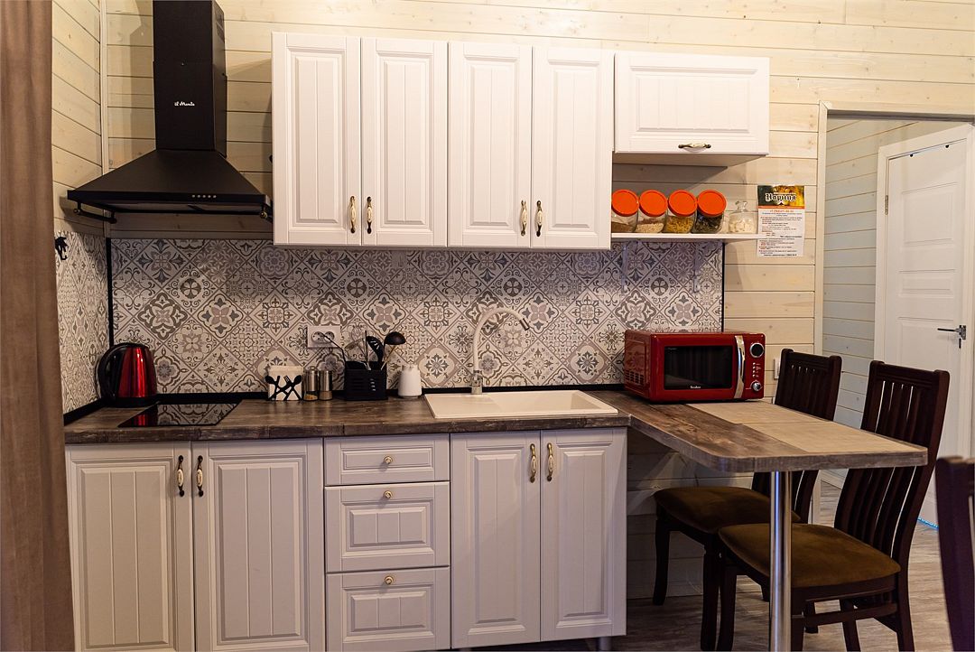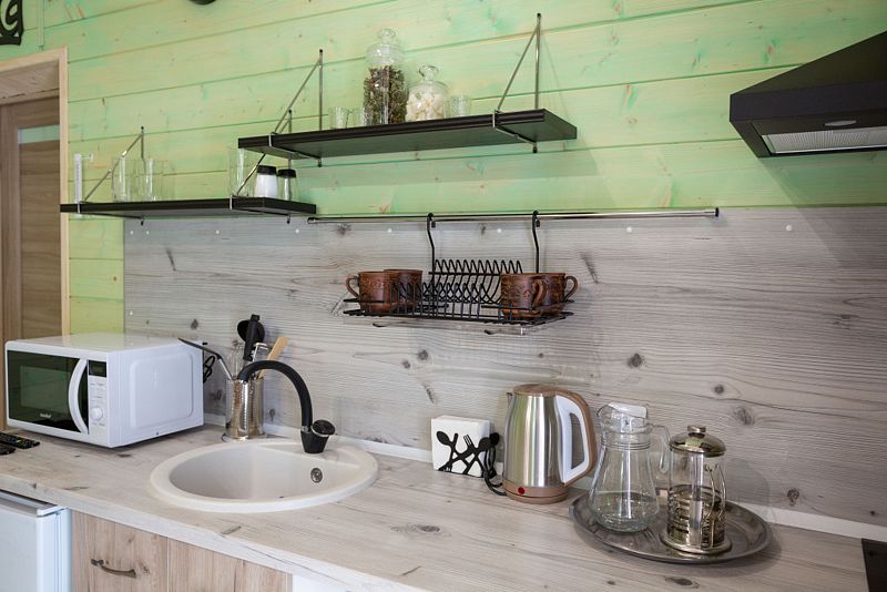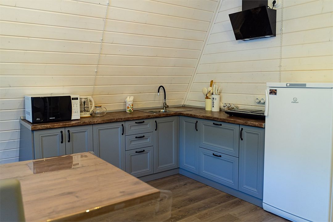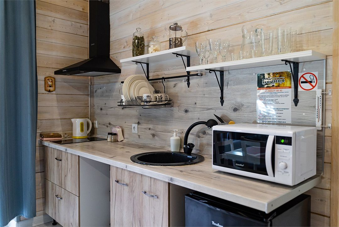 Кухонные зоны полностью оборудованы необходимым количеством техники для приготовления еды, холодильниками, индукционной плитой и СВЧ, а также обеденными столами, приборами и посудой.