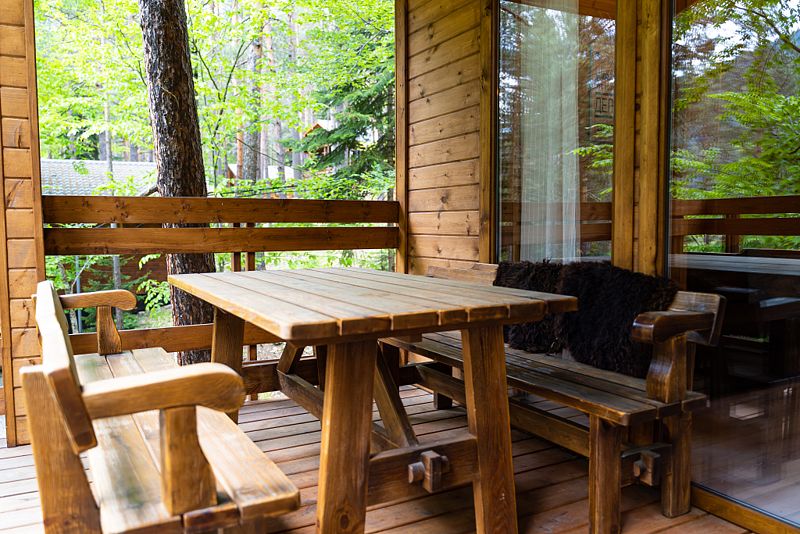 Светильник, уличный стол и стулья из тикового дерева, вода из артезианской скважины, информационная карта, меню, межкомнатная дверь, навес, ламинат, фумигатор, высокие потолки, плиточное покрытие, экологичный подход.