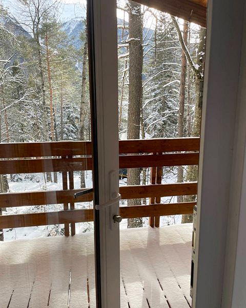 Классическое горное шале с большой террасой, одной спальней и большой кухней гостиной, расположенное на склоне в хвойном лесу. С крытой террасы в 24 м2 открывается невероятный вид на горы.