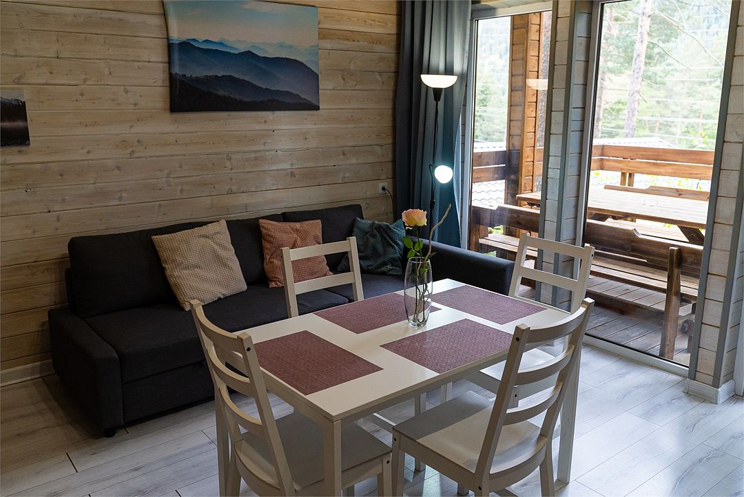 Уютное шале с большой террасой, прекрасным видом на горы в хвойном лесу со стабильным интернетом подойдет как для влюбленных и семейной пары с детьми, так и для работы на удаленке.