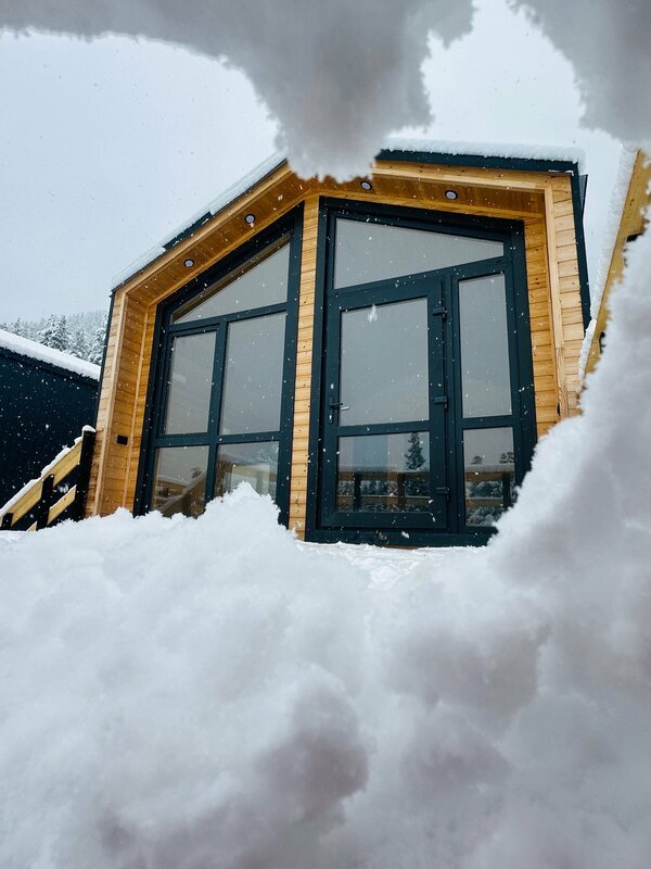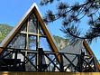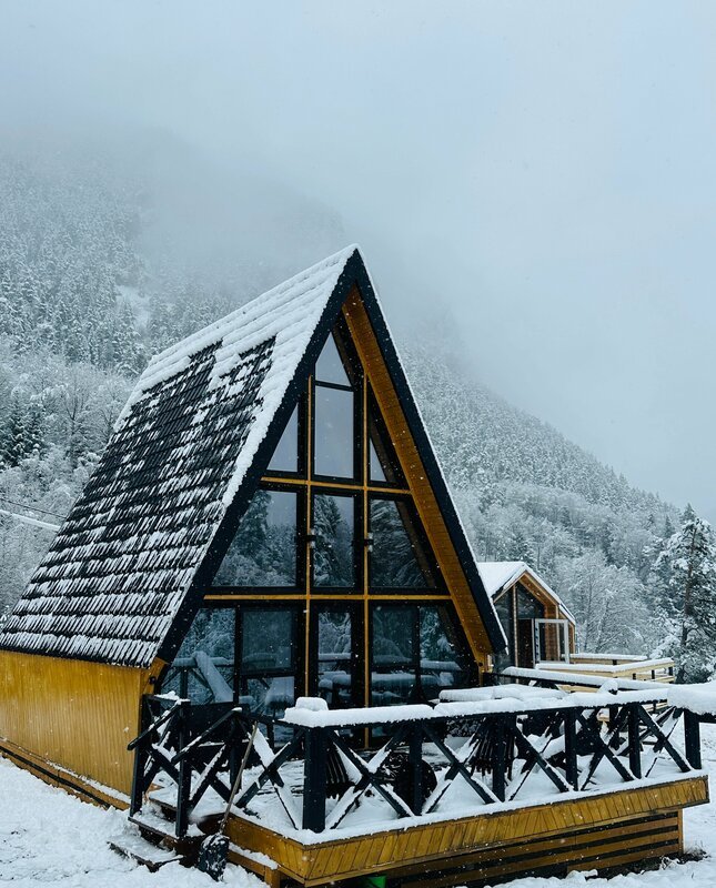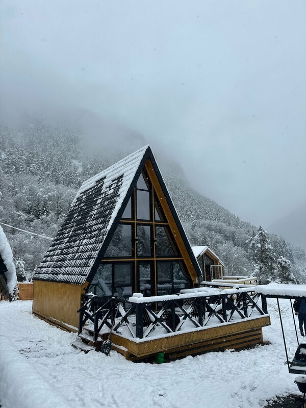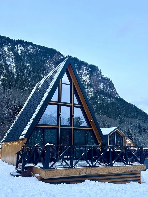 Уютные домики в стиле A-frame с видом на горы и лес. Каждый дом A-frame рассчитан на проживание до четырех человек, имеет кухню-гостиную, спальню на втором этаже, санузел.