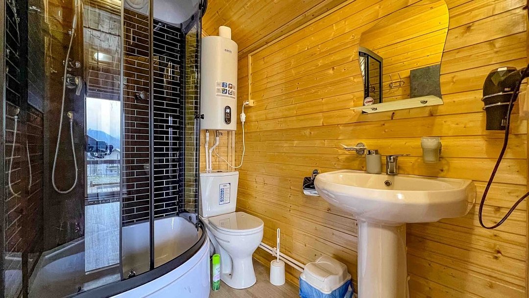 Wi-Fi, холодильник, фен, микроволновая печь, обогреватель, душевая кабина, водонагреватель, банные полотенца, терраса, двуспальная кровать, тумбы, стулья, шкаф для одежды, вешалки, раковина, мягкая мебель, отдельный вход в номер, душ, стул, стол, туалетные средства, туалет, панорамные окна, цифровое тв, диван-кровать, гостиничная парфюмерия, вид на горы, вид на лес, мылоВ коттедже