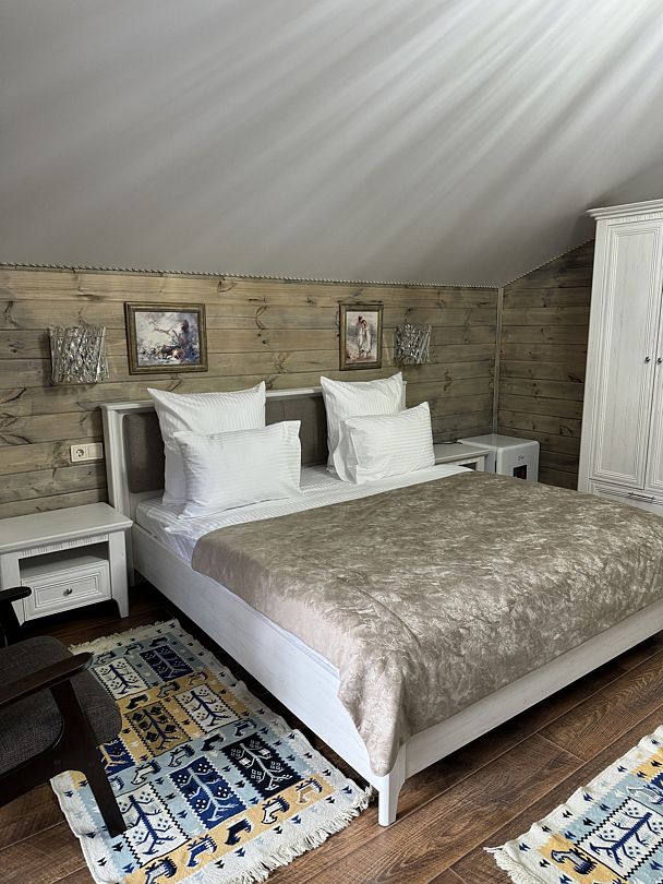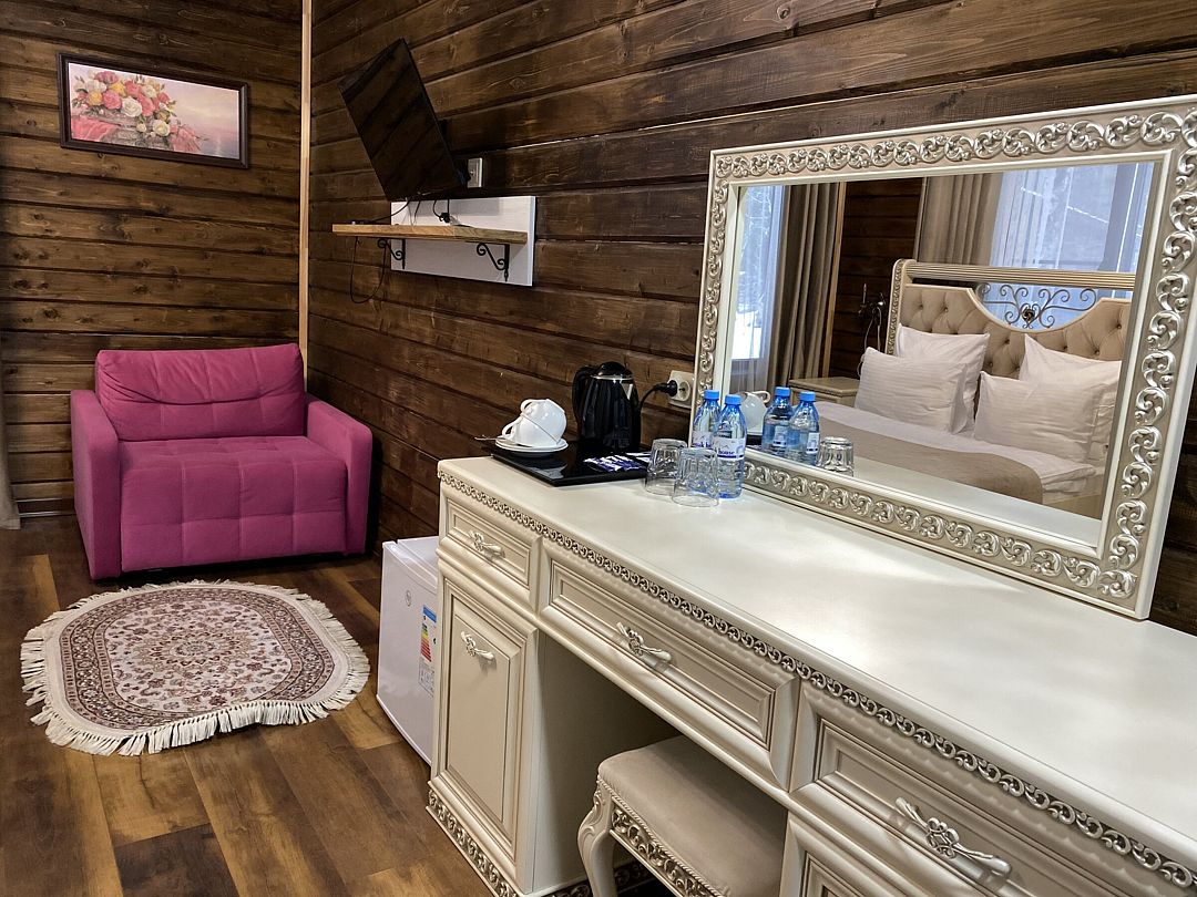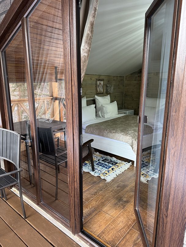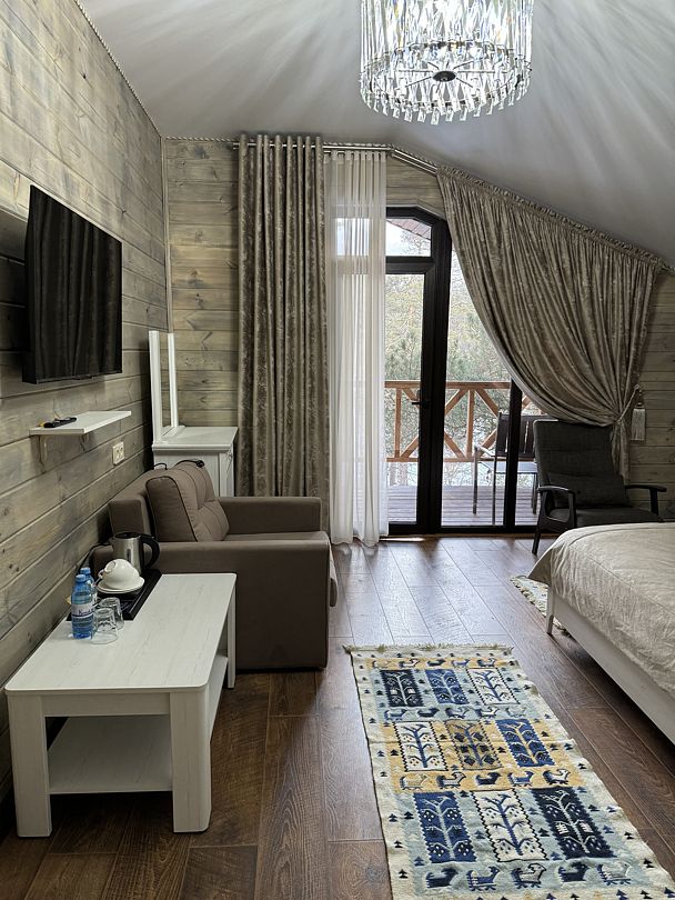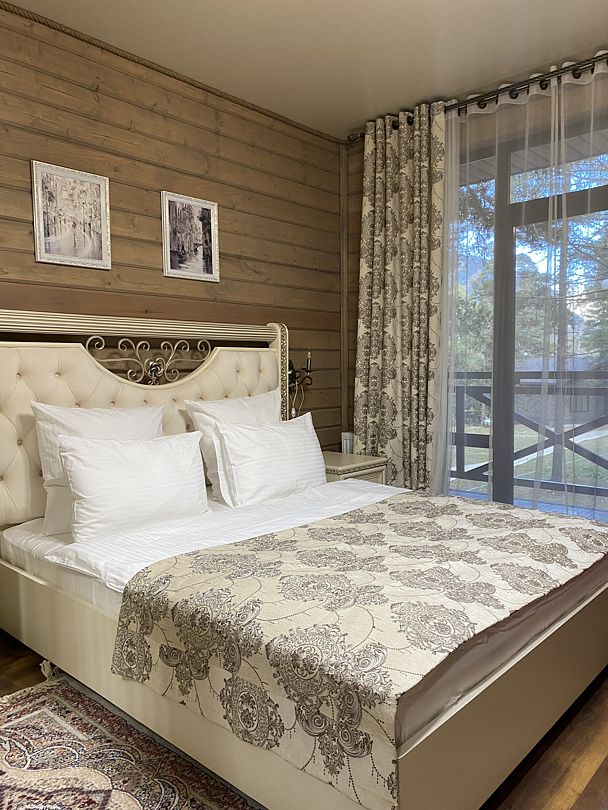 Путешествие с паройПрекрасный отдых, спасибо!Отель находится в живописном месте, коасота божественная, вид на гору, шум реки, пение птиц. Мы жили с мужем в срубе двухместный номер. Понравилось все, в номере уютно,сделано все со вкусом, кровать, подушки очень комфортно, постельное, полотенца, халаты кипельно белые. Уборка, смена постельного, полотенец, халатов каждые три дня( мы проживали неделю). Большое спасибо Софии, эта милая девушка нас встретила и весь период нашего пребывания заботились о том чтоб нам было комфортно отдыхать. Отдельное спасибо девочка, которые убирают номера. Ресторан- подача оригинальная, посуда дорогая, все вкусно, цены приемлемые ( каждый день мы ходили на обеды). Хотела бы я сюда ещё раз приехать- - однозначно да!
