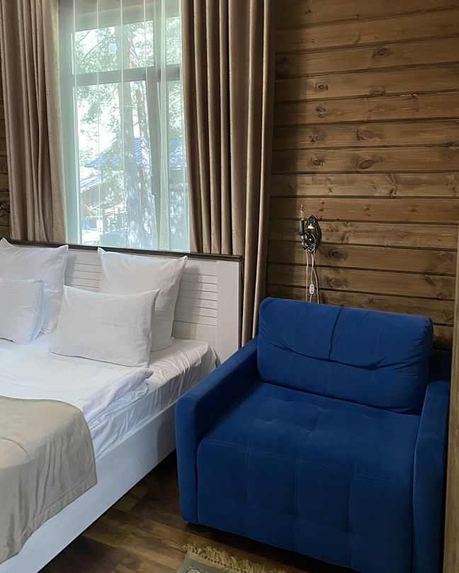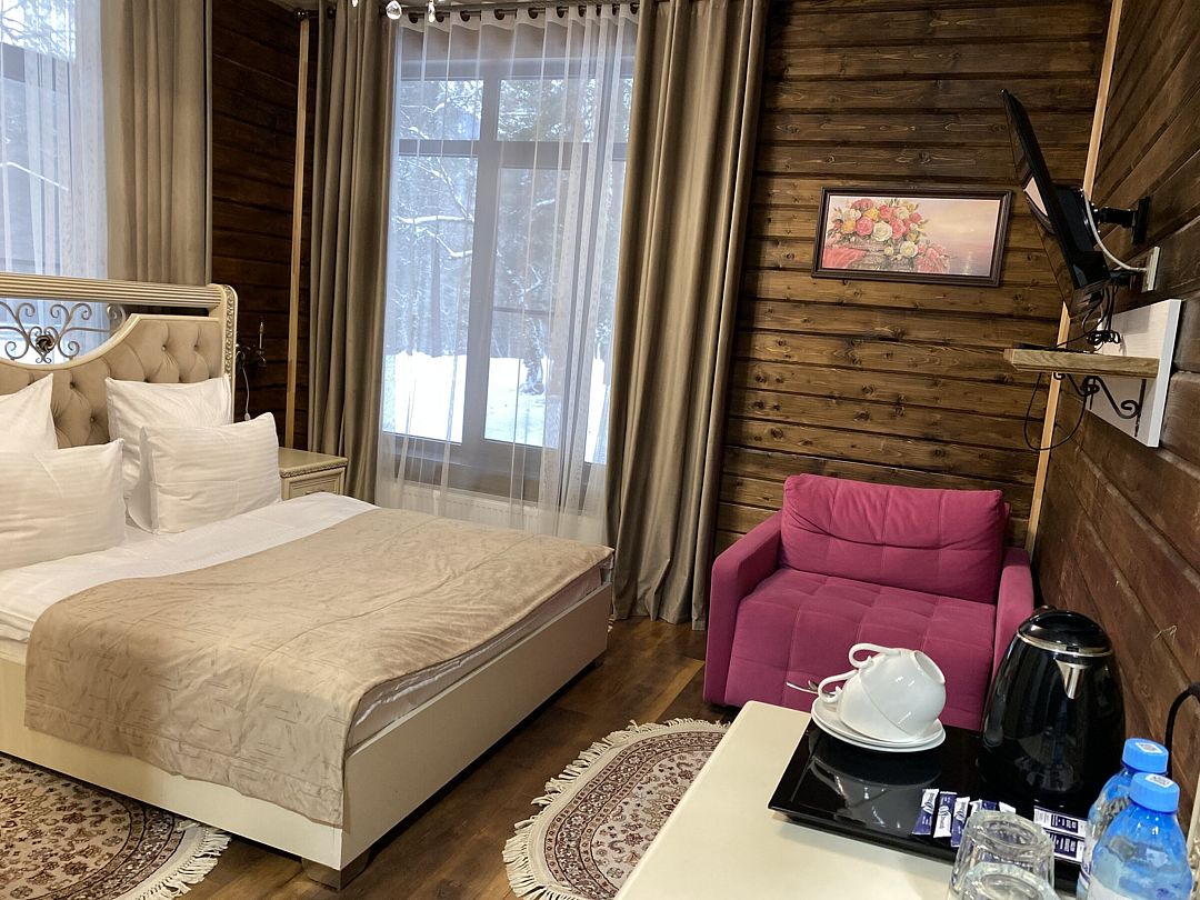 Уютный, комфортабельный номер со всеми удобствами. Номер расположен на первом этаже главного корпуса. Размещение до трех человек (двухспальная кровать + одно дополнительное место (кресло раскладное)).