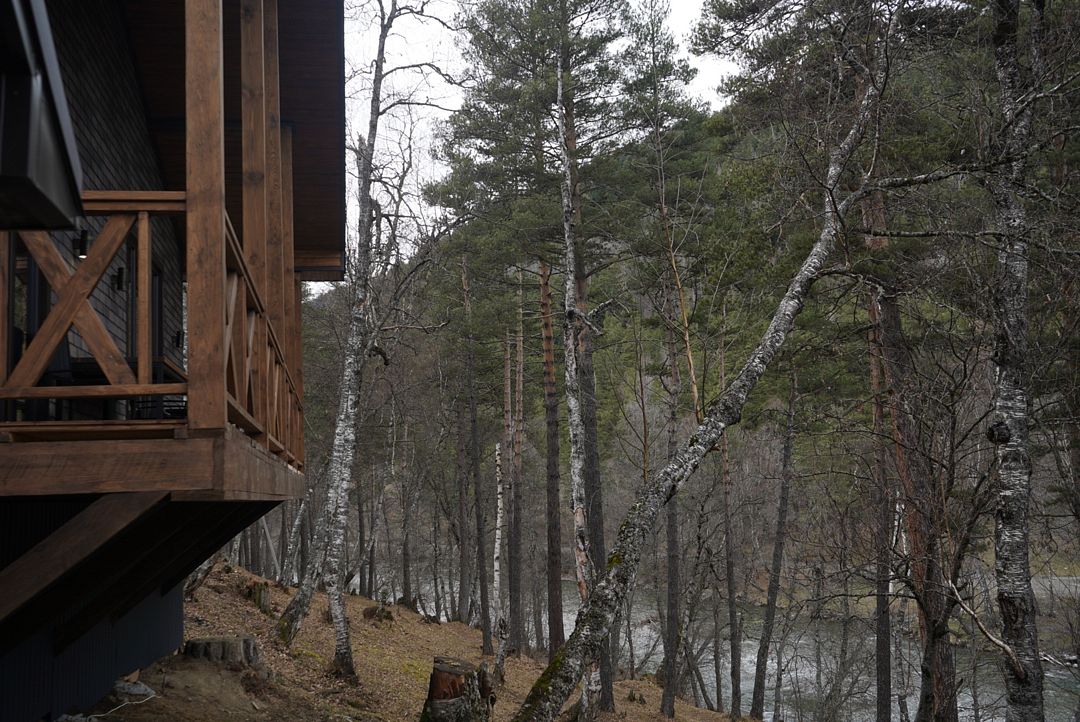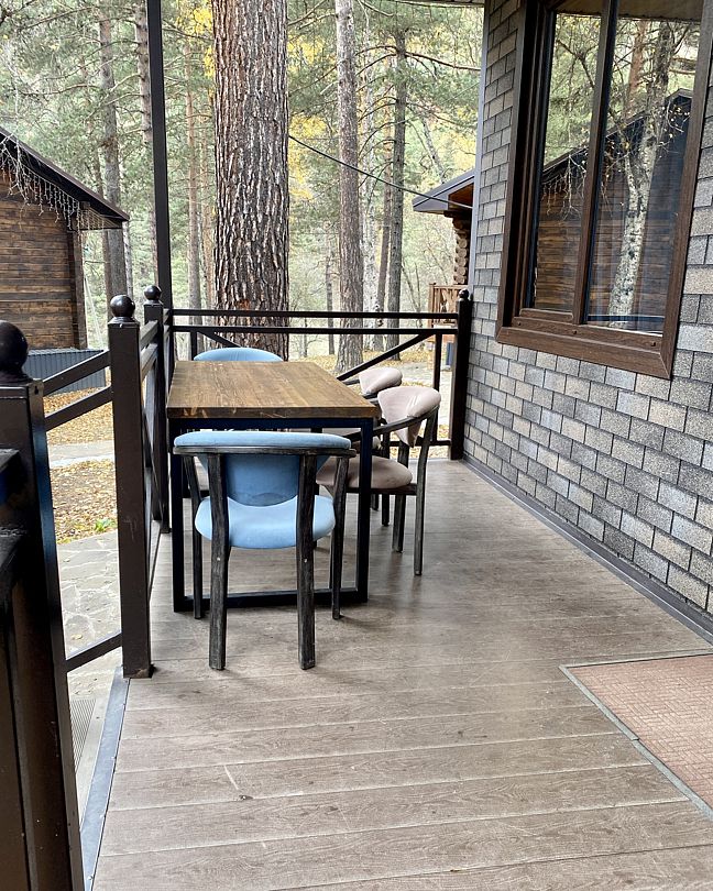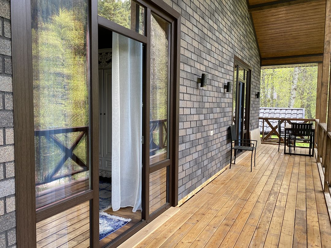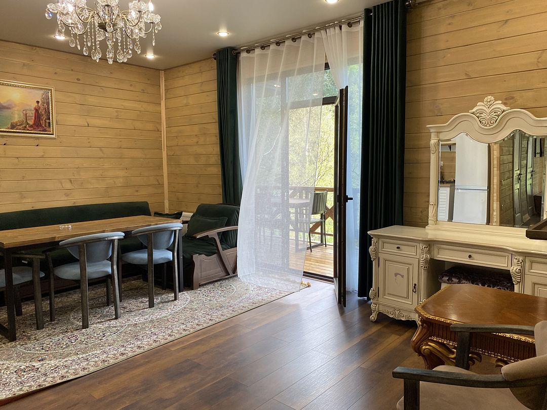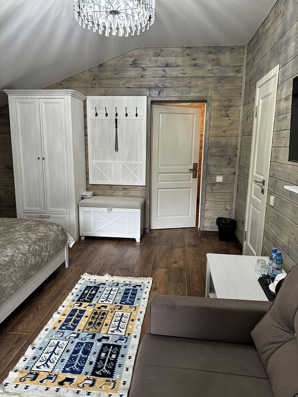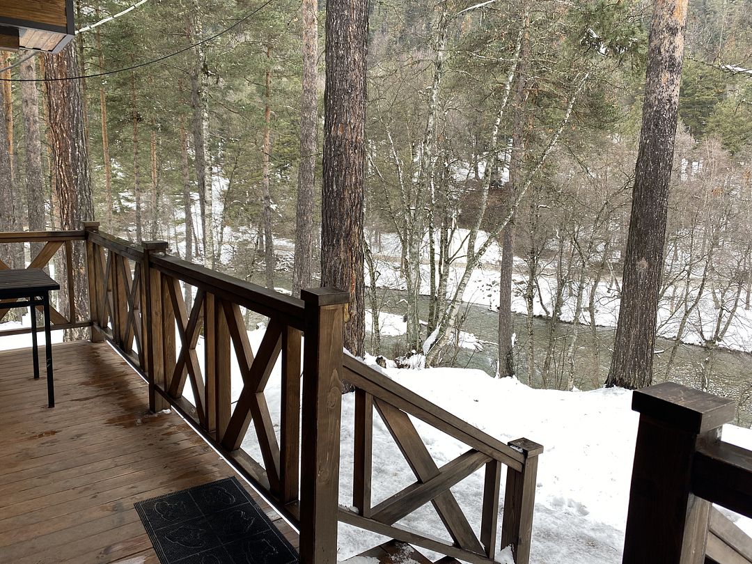 Уютный просторный двухкомнатный номер — отличный вариант для большой семьи или небольшой компании. Есть свой отдельный вход, терраса с видом на лес, реку и горы.