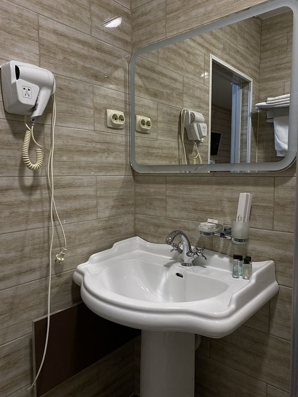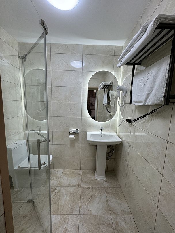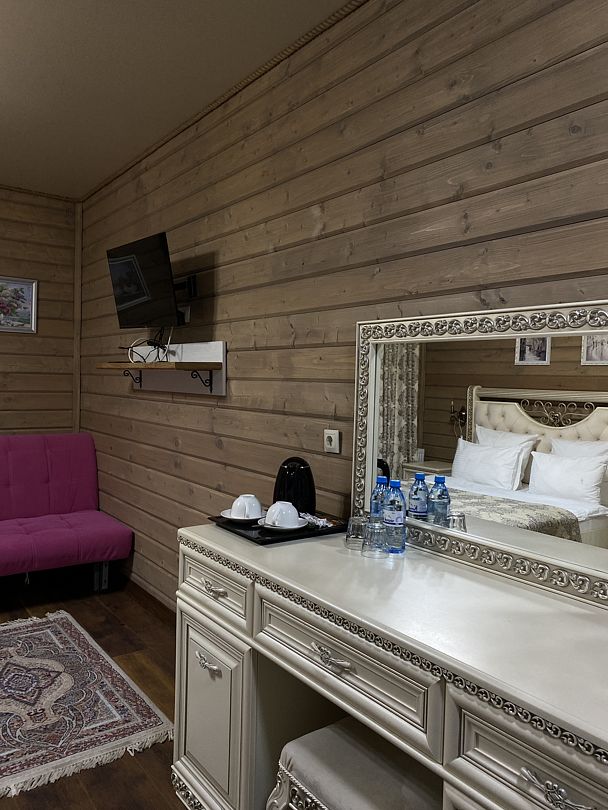 Не выбраноДостоинстваОтель оставил только положительные эмоции, территория большая ,чистая ,ухоженная ,вся утопает в зелени ,номер уютный ,просторный ,красивый ,оснащенный всем необходимым (тапки ,халаты ,туалетные принадлежности ,вода ,чай ,кофе ,все пополняется каждый день ,уборка в номере тщательная . Есть баня и подогреваемый бассейн, завтраки вкусные ,,еда в ресторане выше всех похвал 👍👍👍