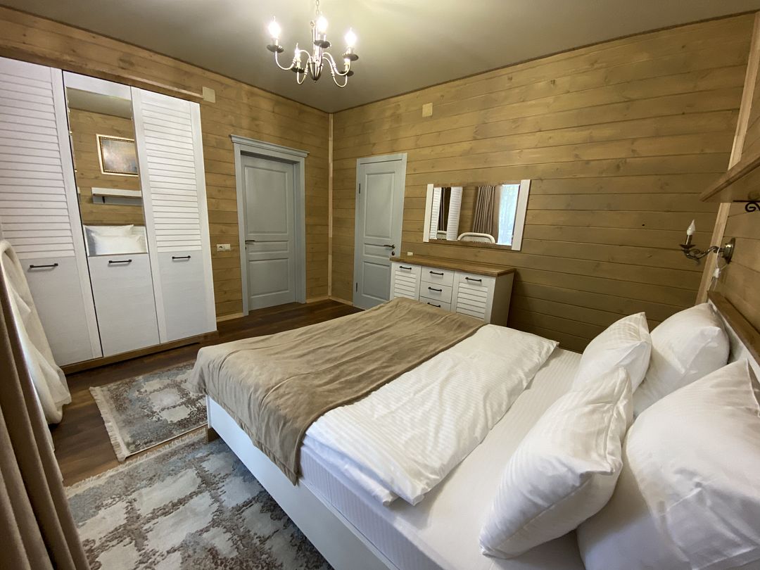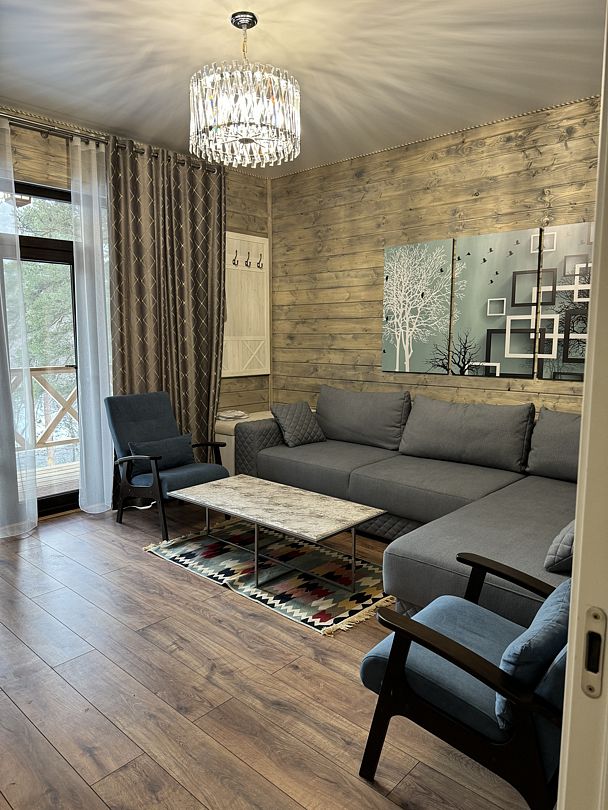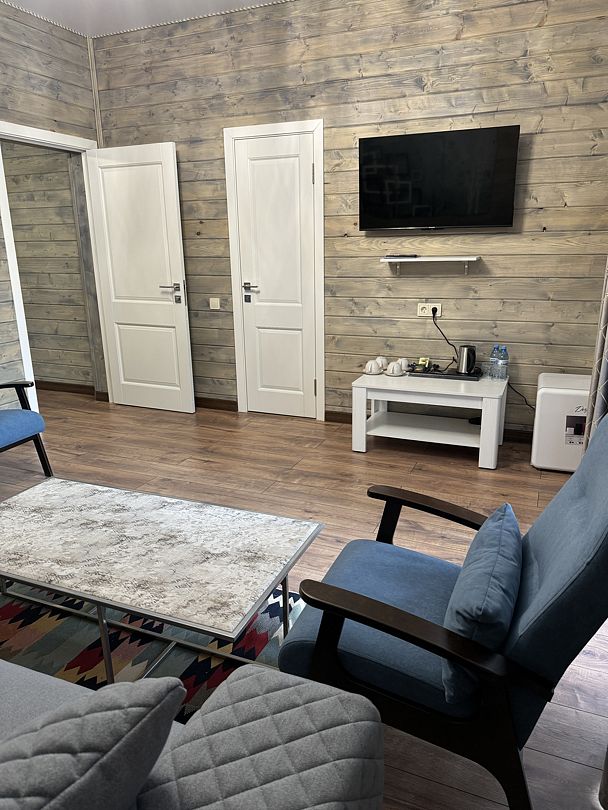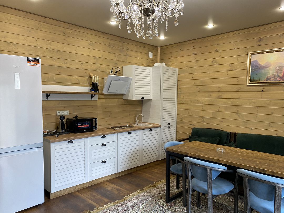 Уютный домик для семейного отдыха. Есть две спальни и небольшая гостиная. Размещение до шести человек. Есть свой мангал и терраса.