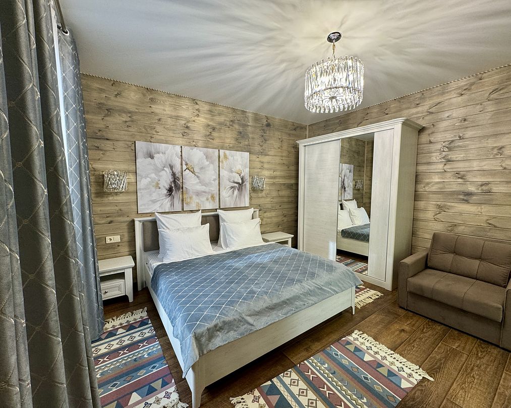Уютный светлый номер для комфортного семейного отдыха. В номере есть все необходимое для вашего отдыха. Размещение до четырех человек (двухспальная кровать + диван раскладной).