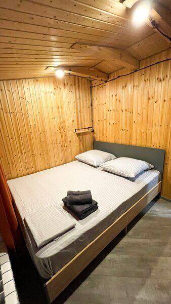 Двухкомнатный дом, состоящий из кухни-гостинной с двуспальным диваном, Smart TV и обеденным столом, спальни с двуспальной кроватью, санузлом с душевой кабиной.
