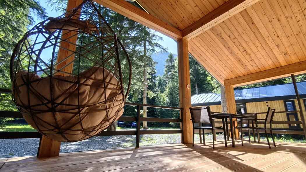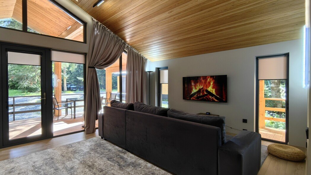 Главная особенность базы — просторные и роскошные премиум-коттеджи, которые создают атмосферу уюта и благополучия. Каждый из них оснащён отдельной гостиной зоной с удобными диванами и панорамными окнами, из которых открывается великолепный вид на величественный лес.