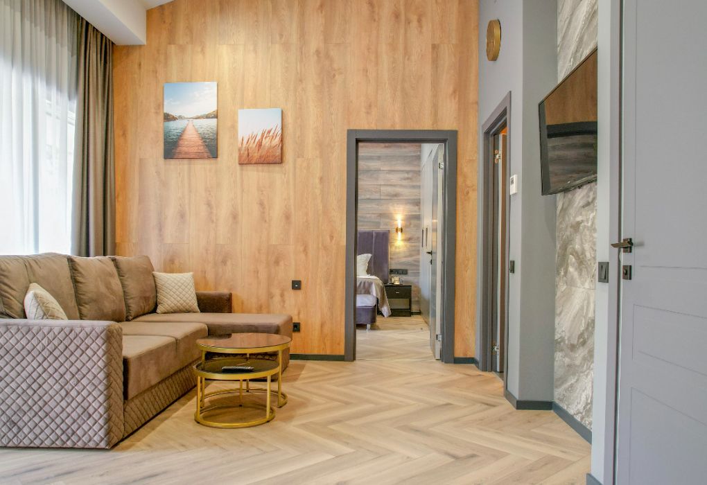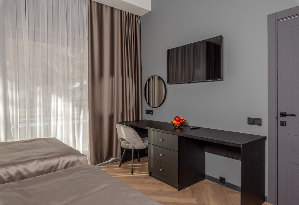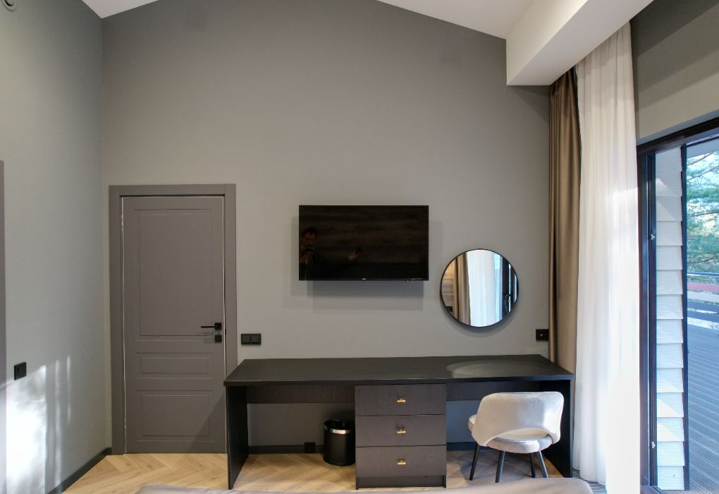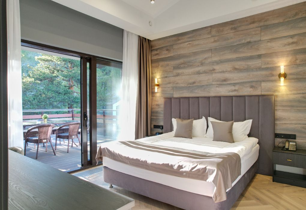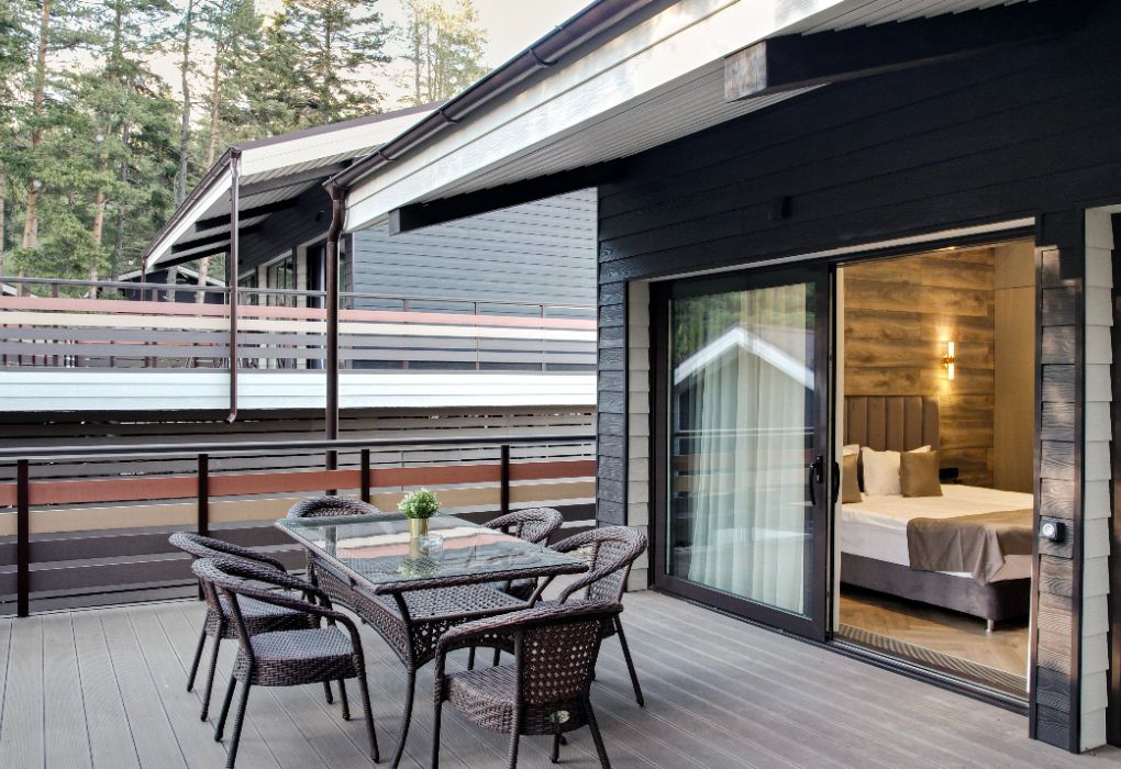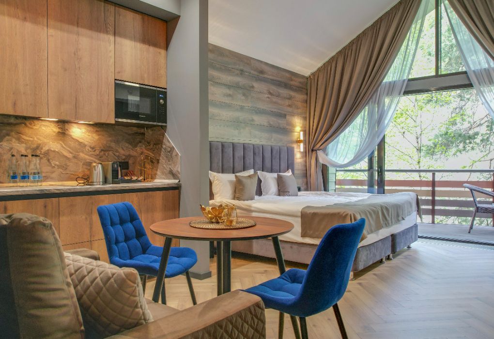 Путешествие с семьейВеликолепный отель!Отель прекрасен! Расположен в лесу, номера 3х комнатные с видом на лес, огромный балкон на котором есть стол и плетеные стулья (кстати на стулья можно было бы положить что-то мягенькое)), но это так если уж совсем придераться. Номер с офигенным, стильным ремонтом, всё продумано, освещение хорошее в номере, положили даже чистую губку для мытья посуды, полотенце кухонное, есть капсульная кофемашина, посуда (тарелки белые без сколов), столовые приборы, кружки разных размеров, бокалы, сковородка, кострюля, посудомоечное средство. В ванной комнате нормальный гель для душа, шампунь и т.д , зеркала с подсветкой. Матрасы, подушки, одеяла супер удобные , диван в гостиной удобный. Есть пледы, даже зонт, вода. Из номера просто не хочется выходить. Возле виллы мангал, приносят розжиг, угли, решётки. Завтраки вкусные, горячие. Уборка прекрасная! В каждой комнате есть телефон и даже если администратор не ответил, то перезванивать! Персонал вежливый. Хочется ещё раз вернуться, на более длительный срок!