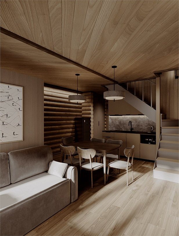 Простор и уединение в горах Двухэтажный коттедж — идеальное решение для тех, кто ценит приватность и комфорт. Просторное здание с панорамными окнами открывает захватывающий вид на горные хребты. На первом этаже: светлая гостиная с камином и мягкой мебелью; обеденная зона на 6–8 человек; полностью оборудованная кухня (варочная панель, духовой шкаф, микроволновка, посудомоечная машина, холодильник, кофемашина, вся необходимая посуда); гостевой санузел; терраса с мебелью для отдыха на свежем воздухе. На втором этаже: три спальни (две с двуспальными кроватями, одна с двумя односпальными); две ванные комнаты (с душевой кабиной и ванной); рабочий уголок с письменным столом. В коттедже: бесплатный Wi‑Fi, телевизор со смарт‑функциями, кондиционер, система отопления. Идеален для семьи или компании до 6 человек.Услуги и удобства