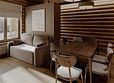 Откройте для себя новый уровень комфорта в номере «Полулюкс». Просторное помещение с продуманной планировкой и панорамным видом на горы подарит вам ощущение свободы и гармонии. К услугам гостей: стильная двуспальная кровать с качественным постельным бельём; зона отдыха с удобным диваном и кофейным столиком; рабочее место с письменным столом и эргономичным креслом; шкаф‑купе с зеркальными дверцами; ЖК‑телевизор с мультимедийными возможностями; мини‑холодильник и набор для приготовления горячих напитков; современная ванная комната с тропическим душем, феном и косметическими принадлежностями. Насладитесь безупречным сервисом и живописными пейзажами в атмосфере утончённого комфорта.Услуги и удобства