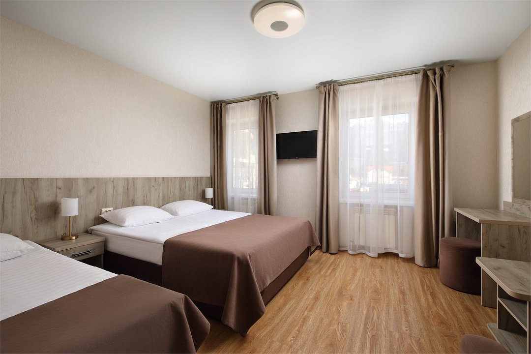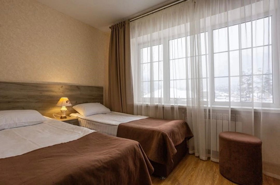 Трёхместный номер в отеле «Монтис Архыз» Просторный и функциональный трёхместный номер — идеальный выбор для семейного отдыха или поездки с друзьями. Расположен в живописном селе Архыз (Карачаево‑Черкесская Республика), в окружении величественных горных пейзажей. Основные характеристики: Вместимость: 3 человека. Площадь: комфортная для свободного размещения троих гостей. Кровати: две односпальные кровати и дополнительное спальное место (раскладная кровать или диван‑кровать). Дизайн: современный горный стиль с элементами натурального дерева, тёплые тона, создающие атмосферу уюта и спокойствия. Оснащение номера: эргономичная мебель (шкаф/гардероб, тумбы, столик); зеркало; телевизор с кабельными каналами; бесплатный Wi‑Fi; кондиционер или система вентиляции; телефон для связи с ресепшен; набор посуды и столовых приборов; чайник; мини‑холодильник. Санузел: душевая кабина или ванна; раковина с зеркалом; туалет; фен; комплект полотенец; гигиенические принадлежности (мыло, шампунь, гель для душа).Услуги и удобства