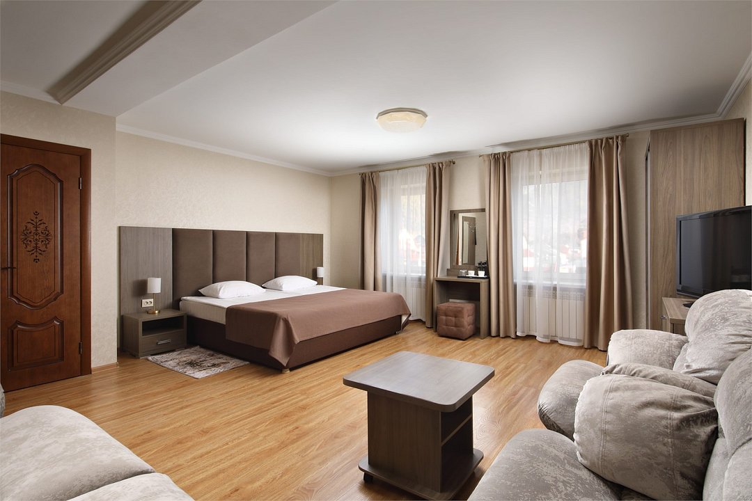 Двухкомнатный люкс в отеле «Монтис Архыз» Просторный двухкомнатный люкс — воплощение комфорта и элегантности в сердце горного курорта. Номер создан для тех, кто ценит уединение, изысканный дизайн и безупречный сервис. Идеален для романтического отдыха, семейного отпуска или деловой поездки с повышенным уровнем комфорта.Услуги и удобства
