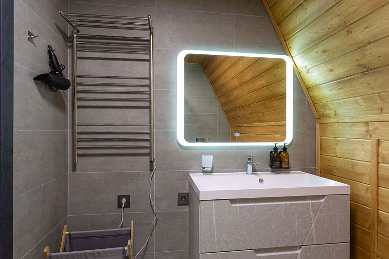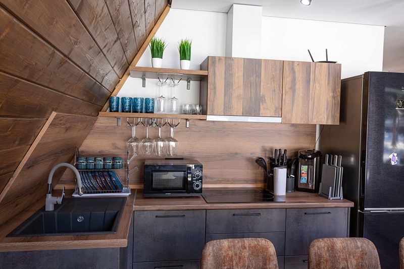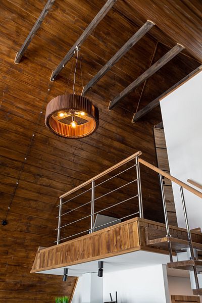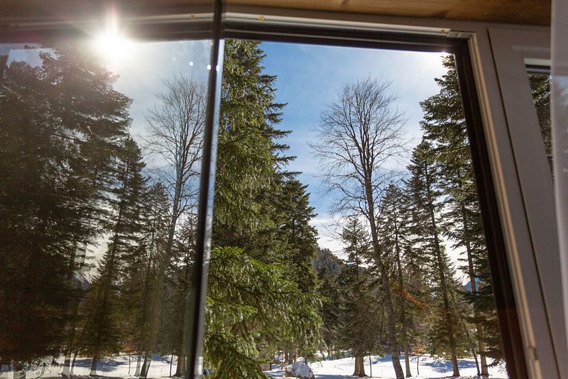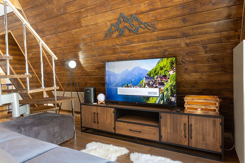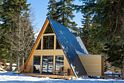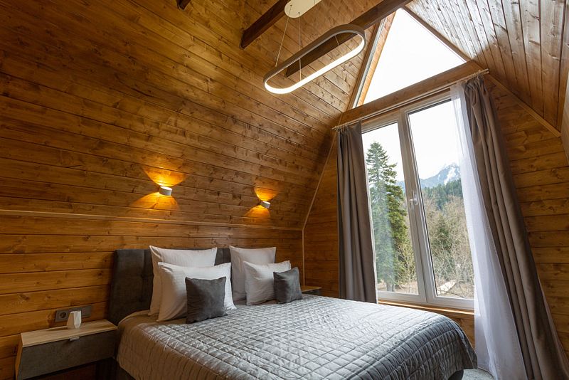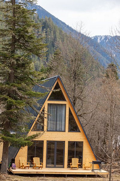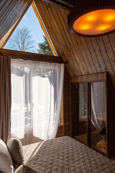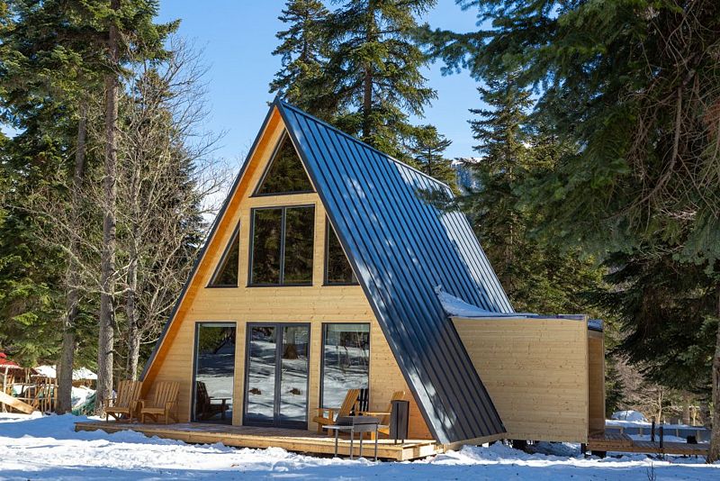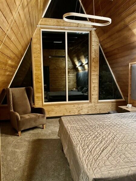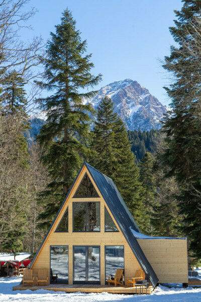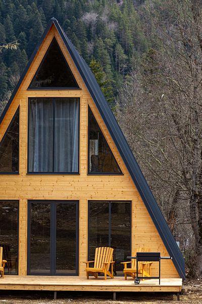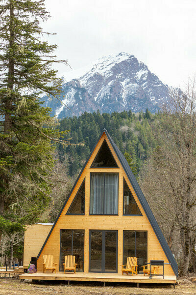 Дом-треугольник имеет площадь 140 кв.м., панорамный вид на лес и горы и 2 этажа.