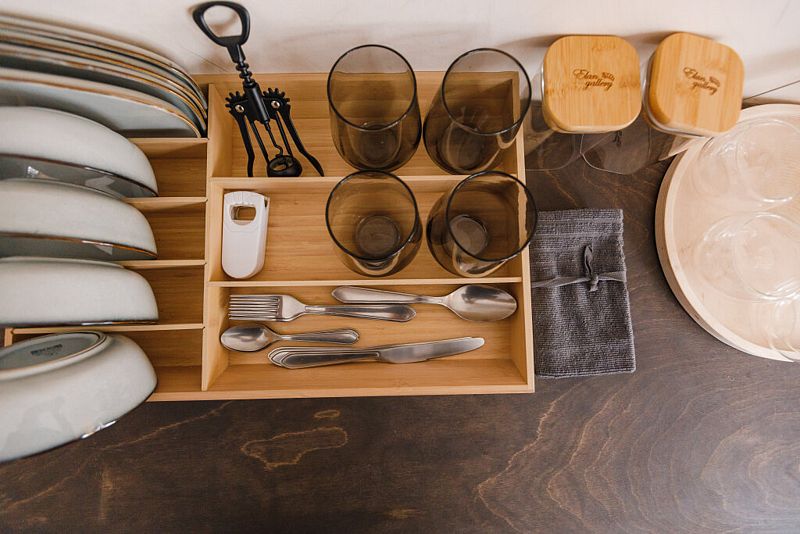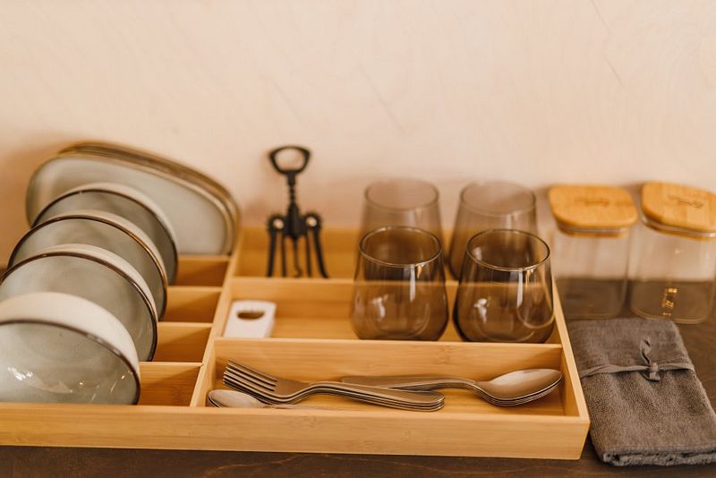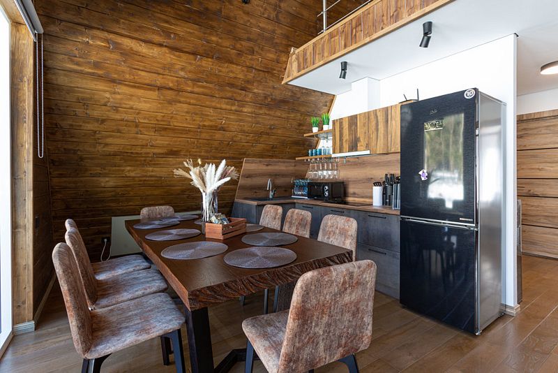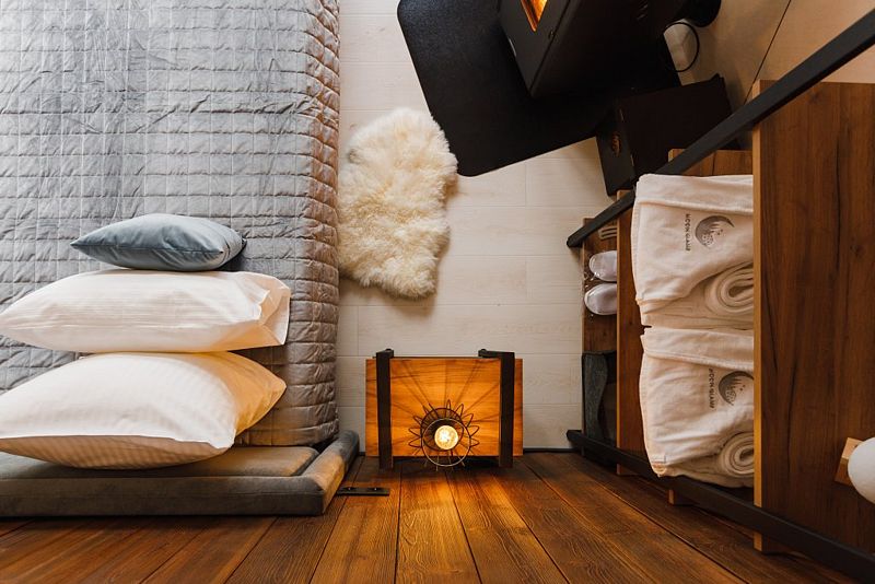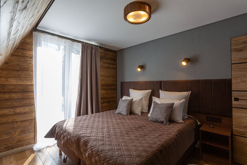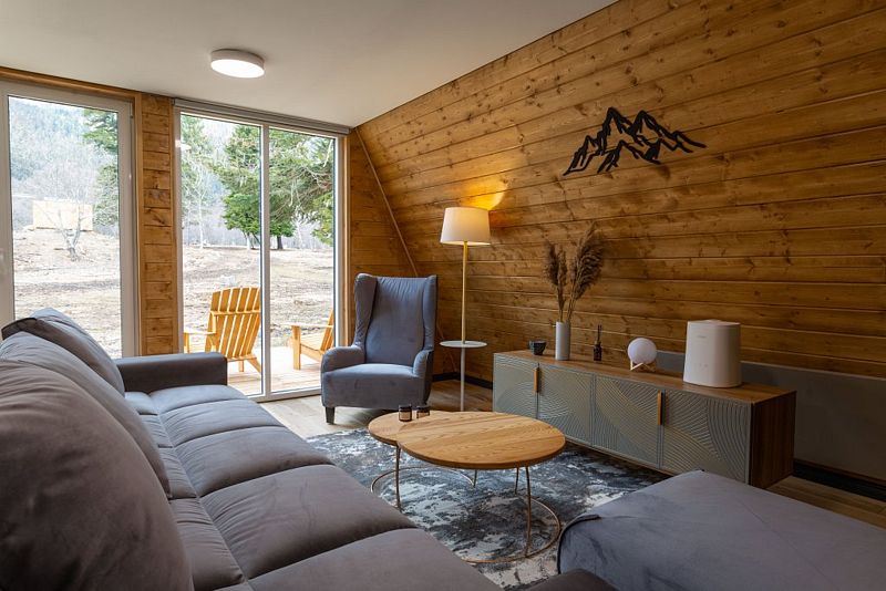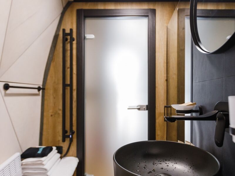 Для гостей 3 больших дома-треугольника, каждый из которых выполнен в индивидуальном стиле: один дом — в светлых оттенках, второй — в теплых светло-бежевых тонах, а третий — в сочетании дерева, черного и насыщенно-зеленого цвета