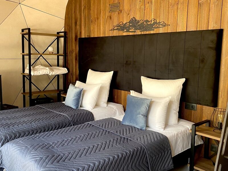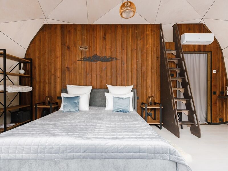 Стандартный купол, площадью 40 м², с видом на хвойно-лиственный лес. В этой категории возможно размещение на большой двуспальной кровати (1,8*2м). Также на втором ярусе 2 спальных места для детей.
