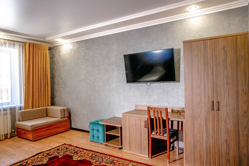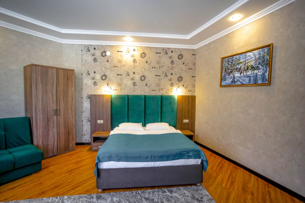 Комфортный однокомнатный номер с большой двуспальной кроватью и креслом-кроватью.