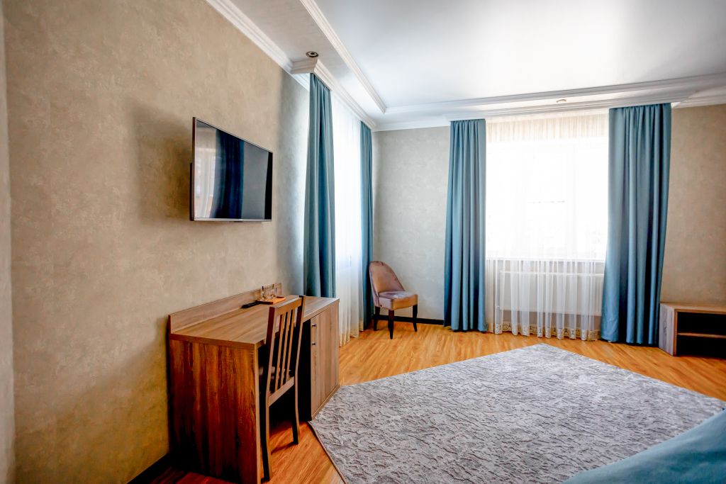 Комфортный однокомнатный номер с большой двуспальной кроватью, раскладным креслом и балконом.