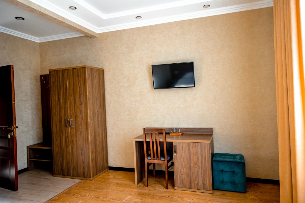 Телевизор с плоским экраном, мини-холодильник, фен, банные полотенца, душевая кабина, тапочки, туалетные средства, вешалки, зеркало, письменный стол, пуфик, стул, шкаф для одежды, москитная сетка, сейф, стаканы.