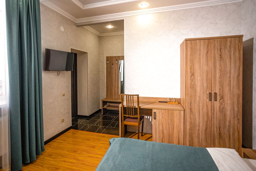 В номере: Телевизор с плоским экраном, мини-холодильник, фен, банные полотенца, душевая кабина, тапочки, туалетные средства, вешалки, зеркало, письменный стол, пуфик, стул, шкаф для одежды, москитная сетка, сейф, стаканы.