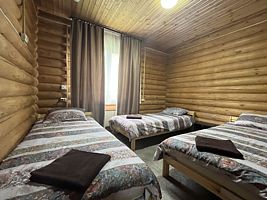 Для проживания гостям предлагаются уютные номера, рассчитанные на 3 и 4 человека. Внутренняя отделка комнат выполнена из натуральной древесины. Установлена удобная мебель для отдыха, есть телевизор и собственный санузел с душевой кабиной. Для больших компаний предусмотрены отдельно стоящие 2-этажные апартаменты из сруба с 4 отдельными спальнями. В каждом домике имеется 2 санузла, а также оборудованная кухня с плитой, микроволновой печью, холодильником, электрическим чайником и посудой. На территории гостиницы есть беседки для отдыха в кругу друзей с мангальной зоной, а также общая кухня для самостоятельной организации питания. Дополнительно постояльцы могут посетить банный комплекс с сауной.