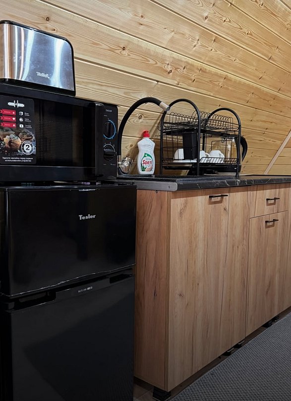 Телевизор со SMART TV, холодильник, микроволновая печь, столовые приборы, тостер, обеденный стол, чайник, фен, полотенцесушитель, санузел с душем, москитная сетка, терраса, беседка, зона барбекю, тапочки, гигиенические принадлежности.